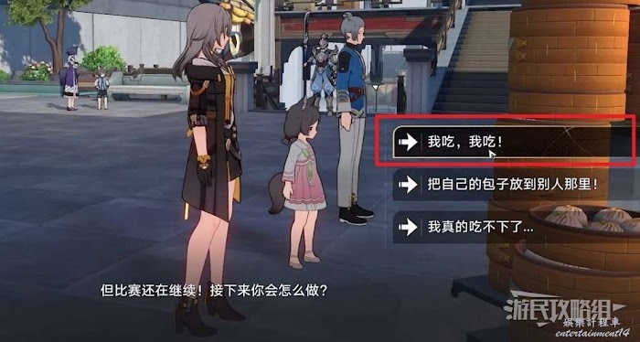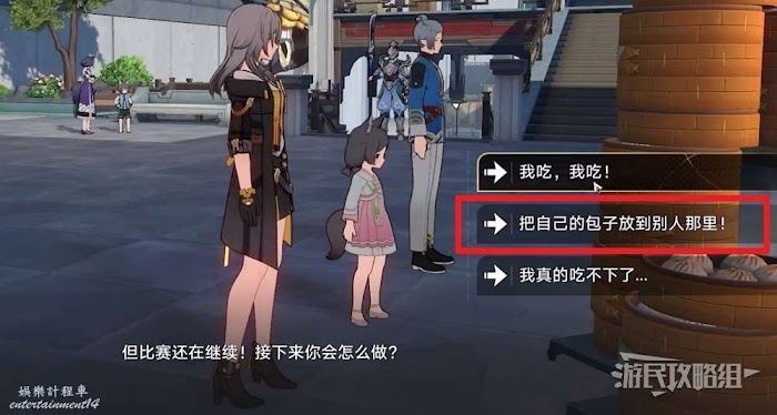 步驟②:在【作戰】階段依次選擇「我吃,我吃!」→「我吃,我吃!」→「水有多少喝多少」→「把自己的包子放到別人那裡!」