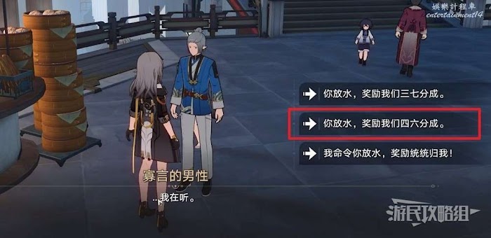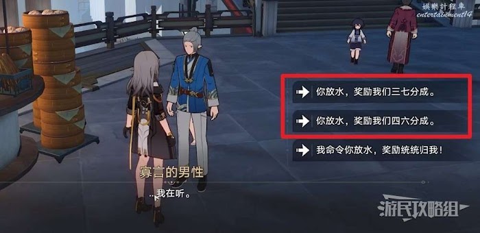 步驟①:在【外交】階段與【寡言的男性】對話時選擇「你放水,獎勵我們四六分成」