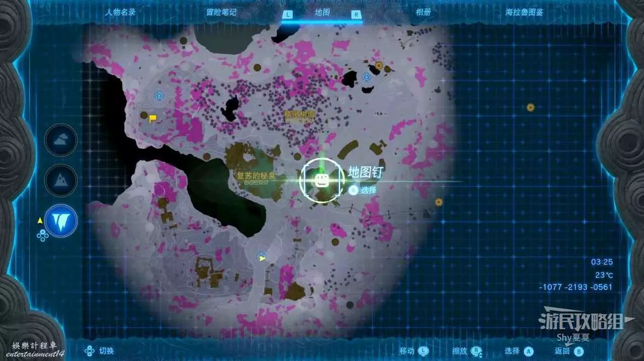 從神廟出來後,可以使用望遠鏡標記另外兩個神廟,按下右搖杆打開望遠鏡,一個在西南方向不遠處,一個在東南方向的上方雪山頂,我們接下來先去西北方的神廟。