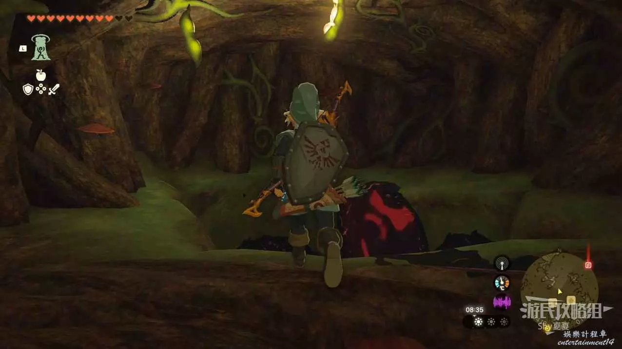 前往海拉魯大森林,建議多準備一瓶【精力藥(4個精力蚱蜢+1個任意怪物材料,精力蚱蜢可以在割草獲得)】,從空中和地面是無法進入的,需要森林西南方向的【齊洛利森林的深穴】進入。