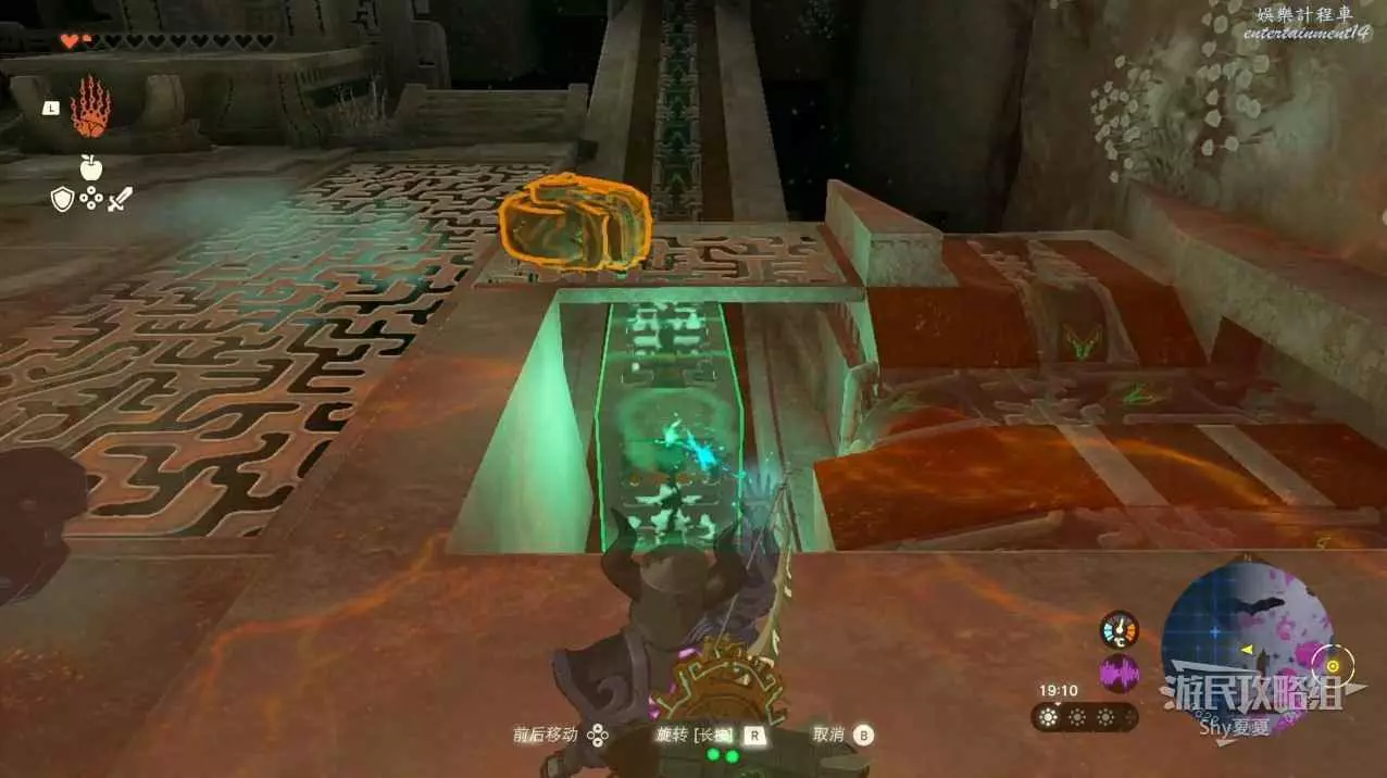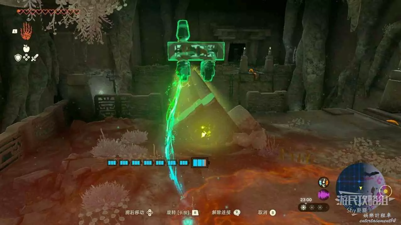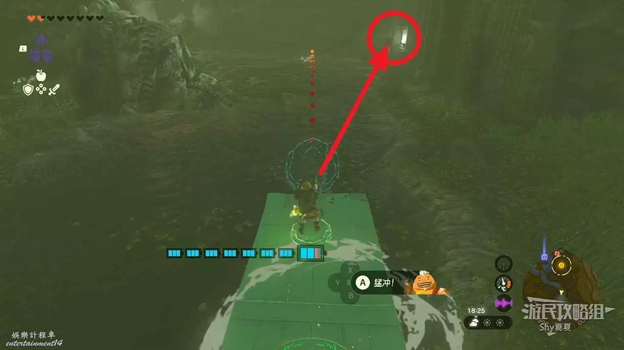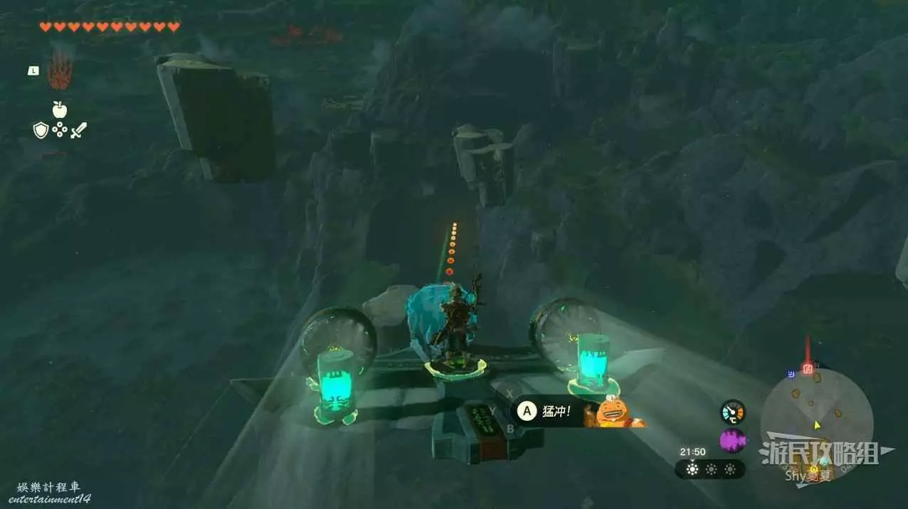 這時先不要啟動,而是利用通天術跑到對面的平臺上,然後用弓箭射擊風扇,就能讓裝置啟動,當經過平臺的時候,用究極手拉過來即可。