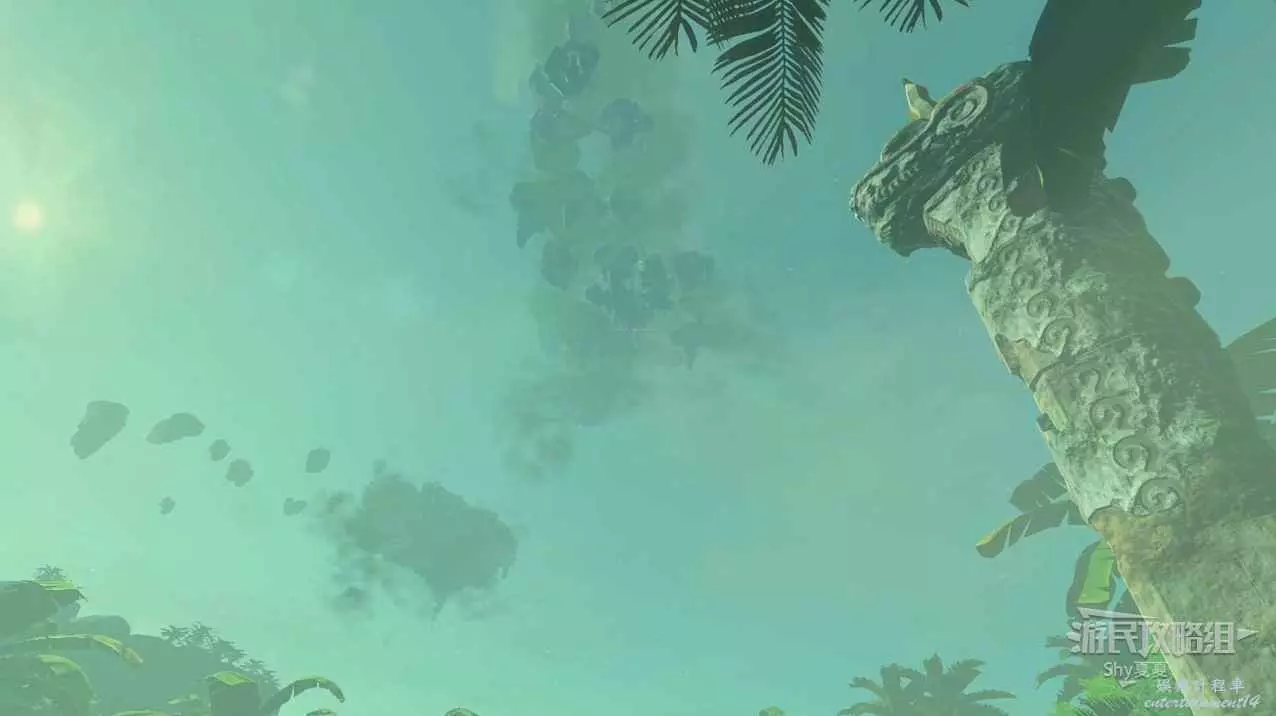到了天上就能看到一個和魚形狀一樣的空島,使用滑翔傘滑到空島。