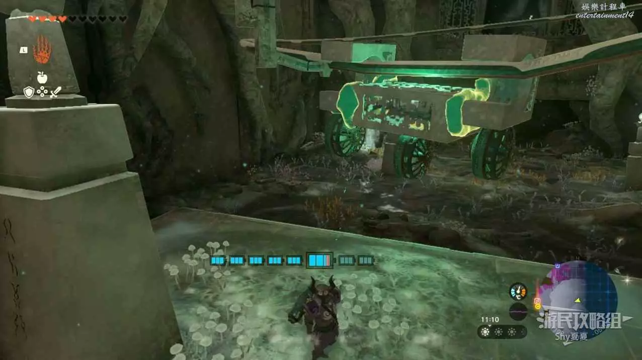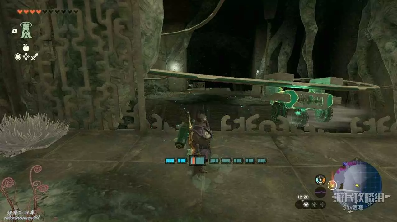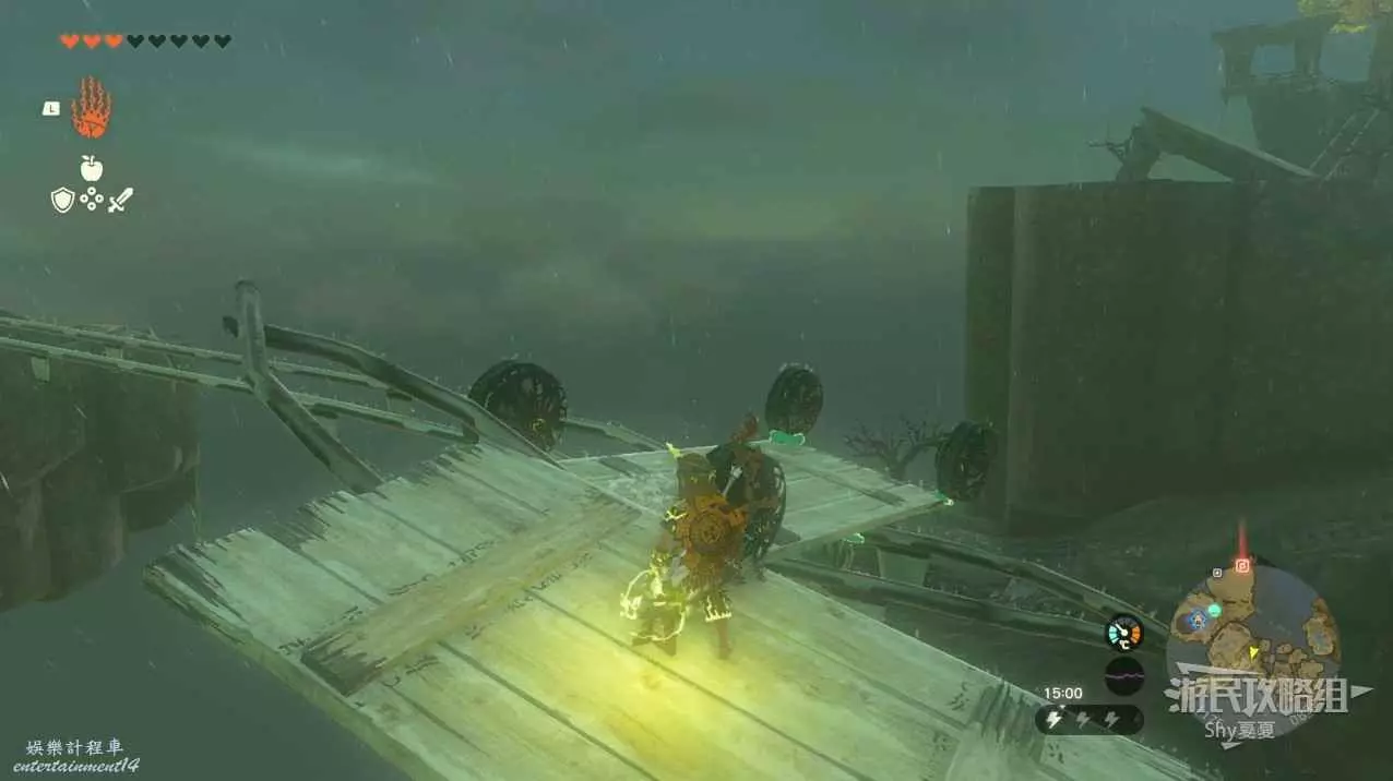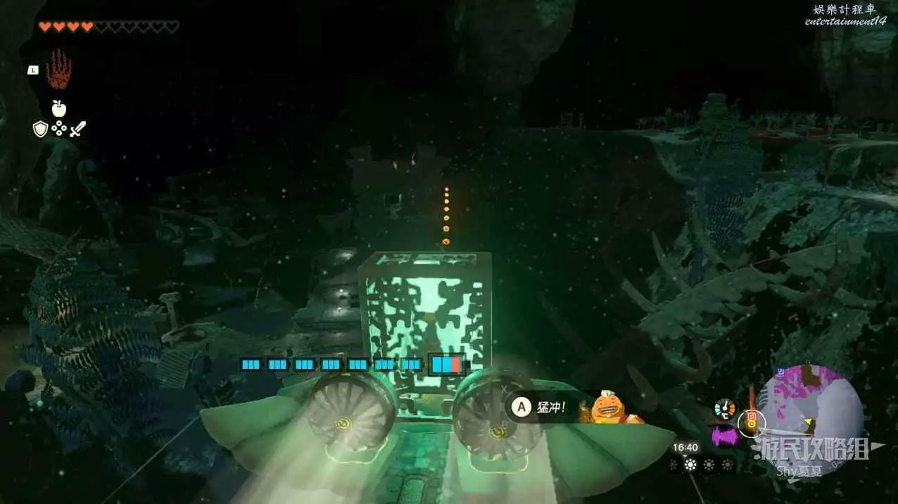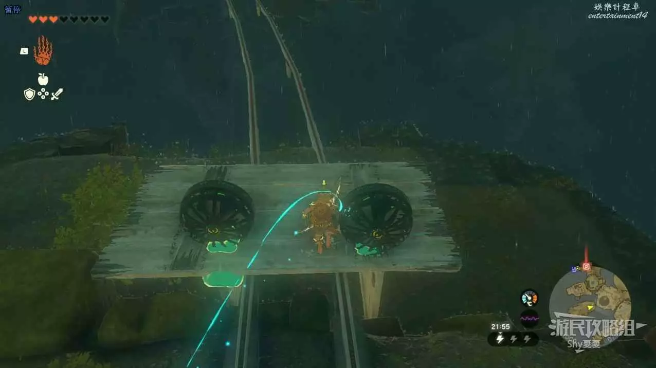走到能看到第一個神廟的地方用滑翔傘往下飛(不用進入神廟),用究極手把木頭組合起來放在軌道上,開啟風扇機沿著軌道前進。