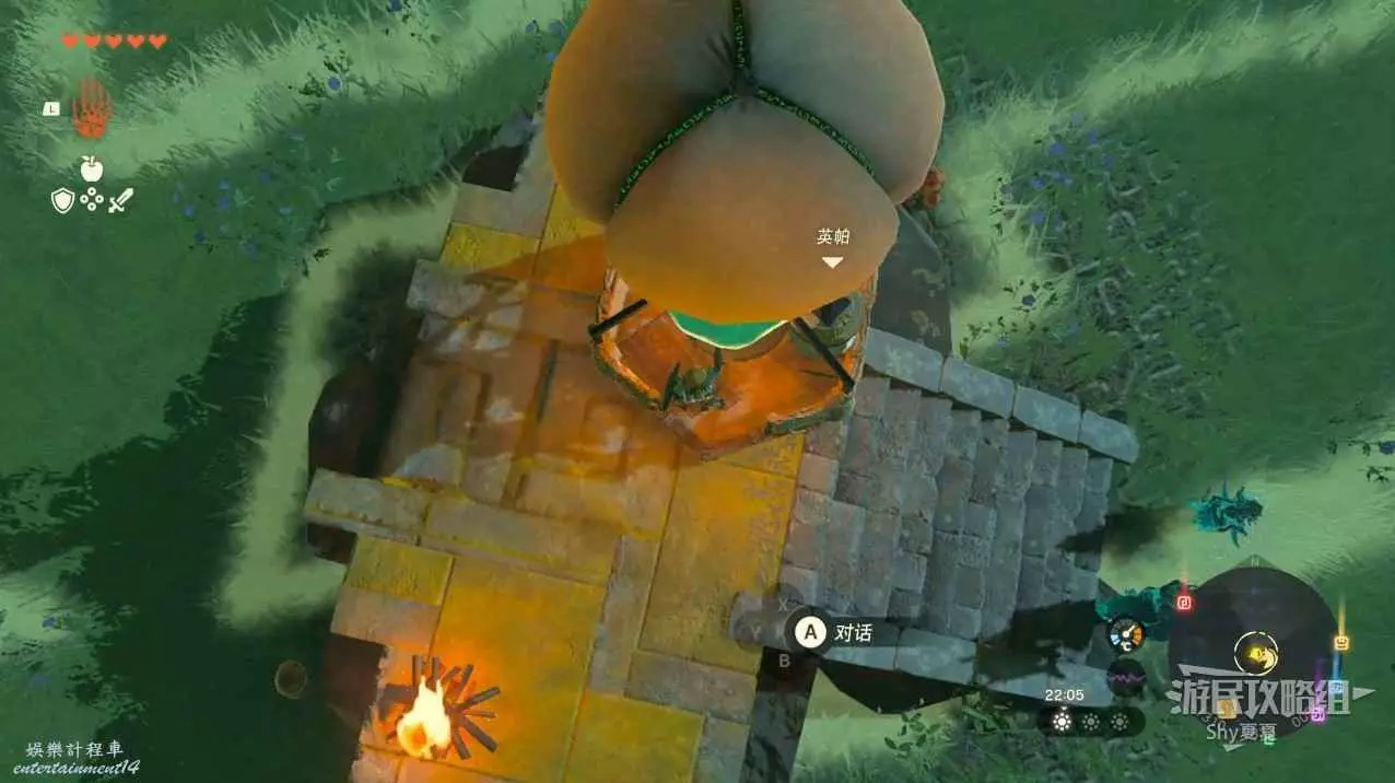 跳到下方之後,朝著時之神殿方向前進,期間會遇到一些敵人,難度都不高,慢慢打就好,在時之神殿前又會遇到一個機器人,它會教我們烤食物,烤過的食物會額外增加50%的血量。