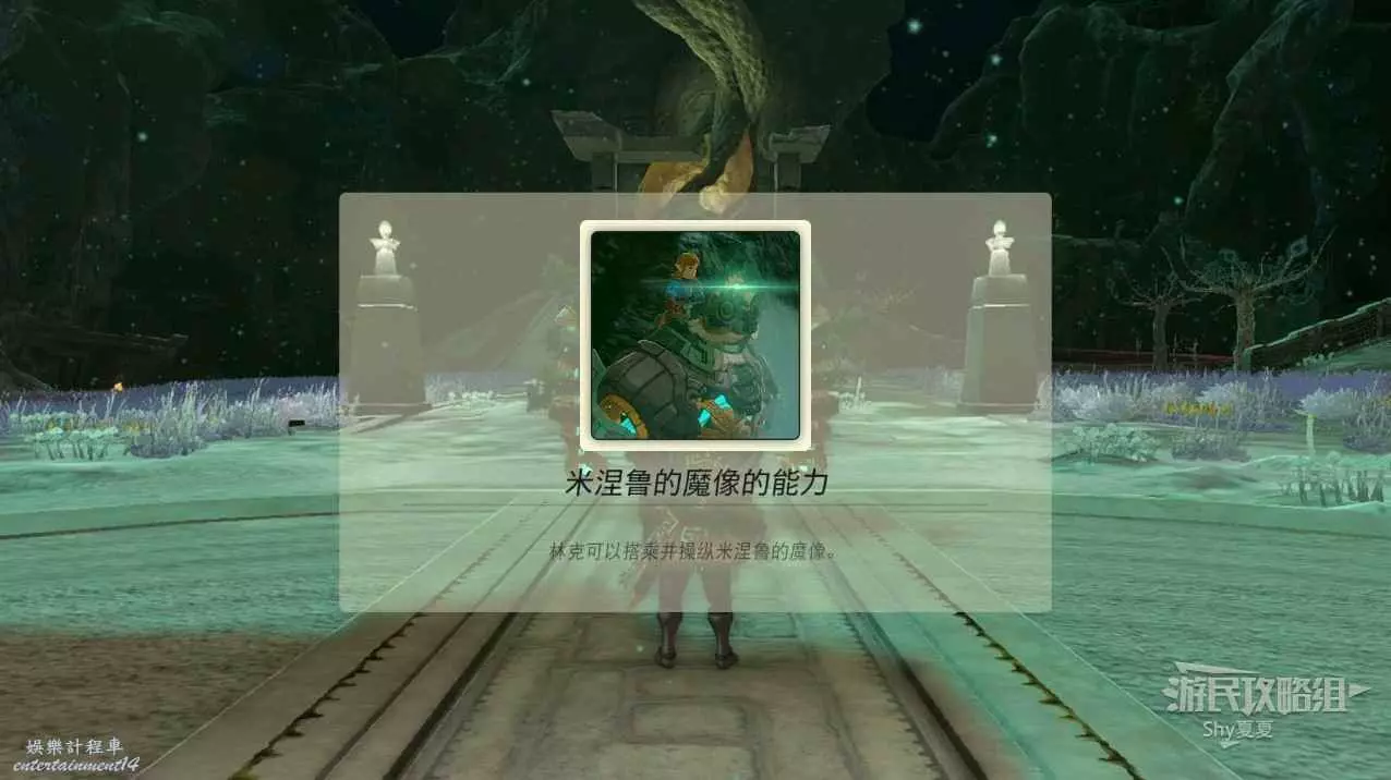 來到時之神殿前互動,勞魯出現,他告訴林克需要先解鎖能力才能進入時之神殿。
