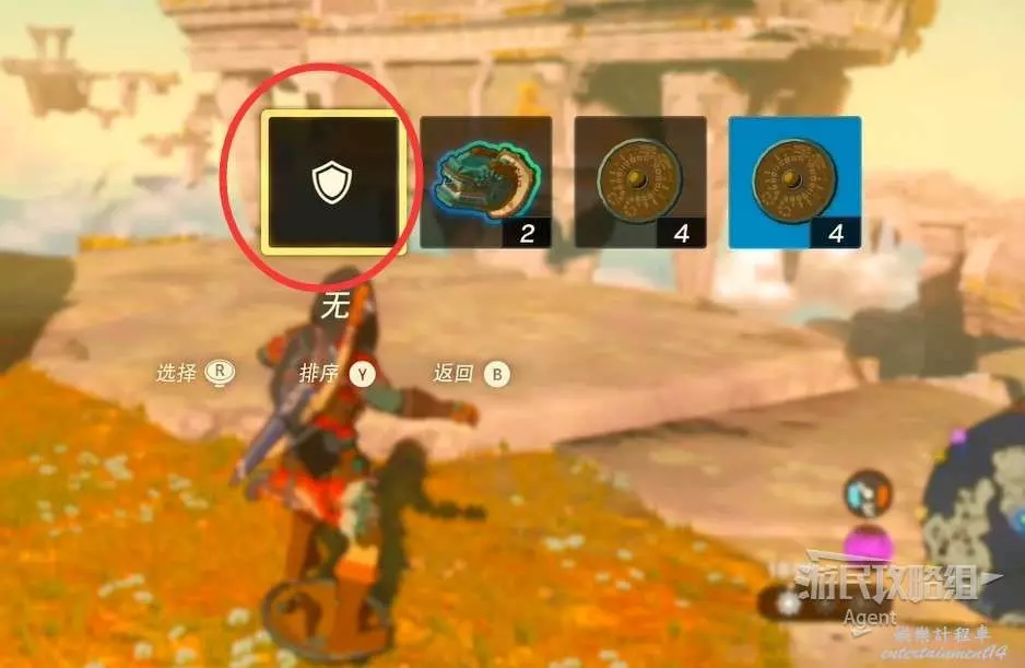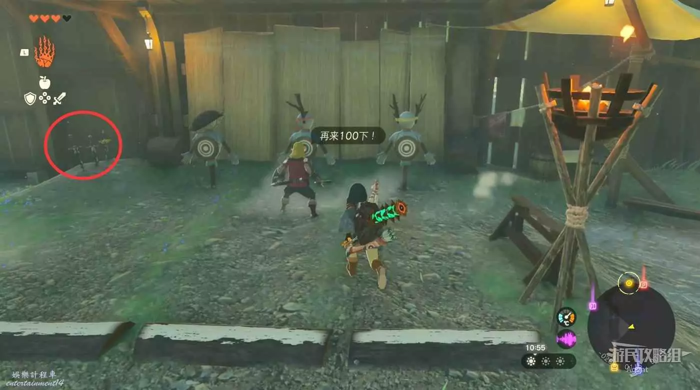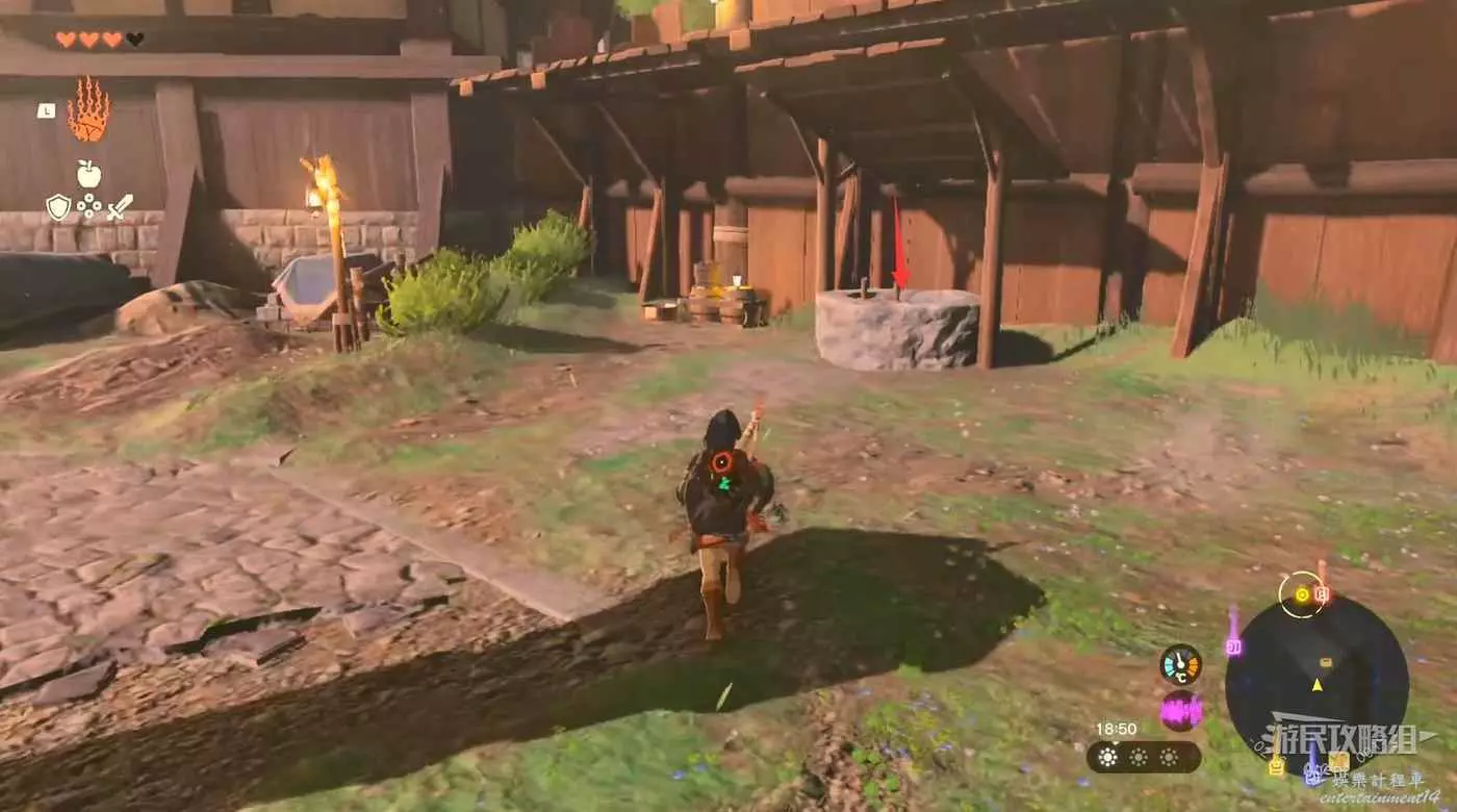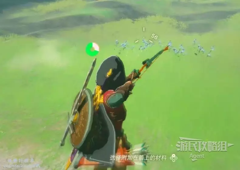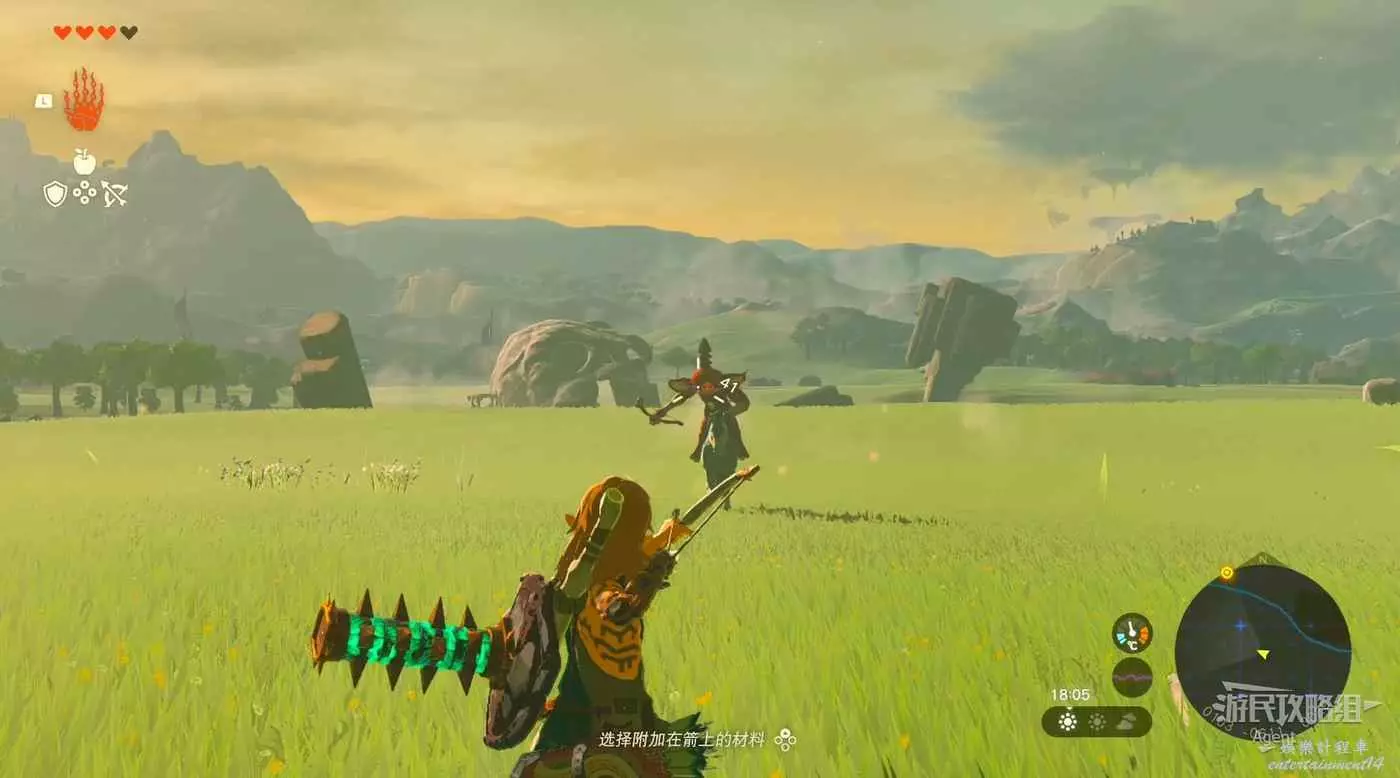 經過右邊水池拿到火焰果和弓,拉弓瞄準時,長按“十字鍵上”選擇附加材料,可以把材料附加到箭上,使箭矢具備特殊效果。