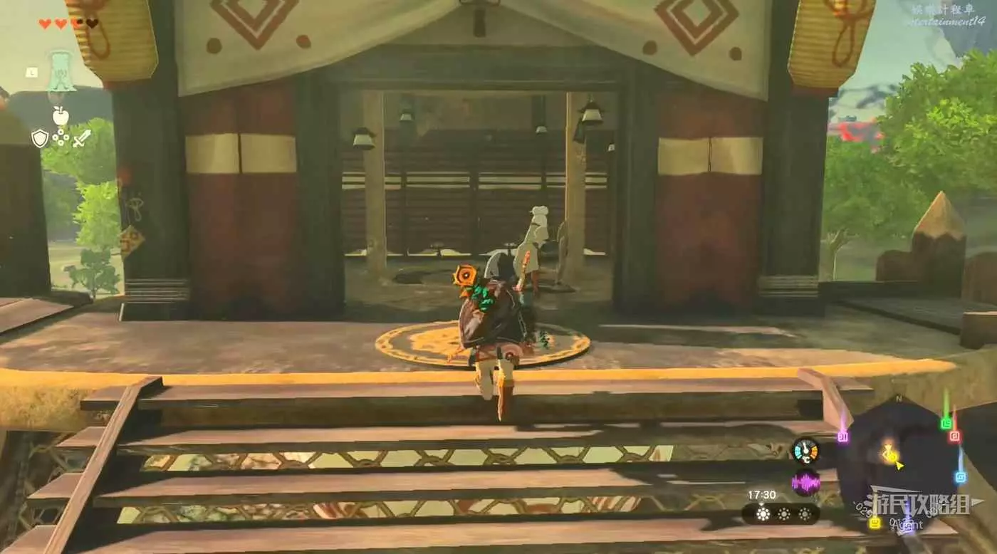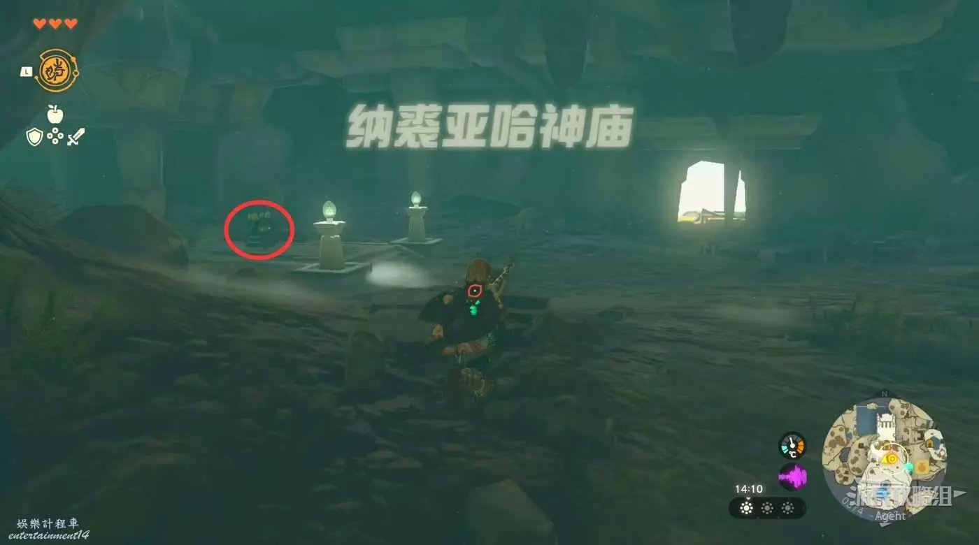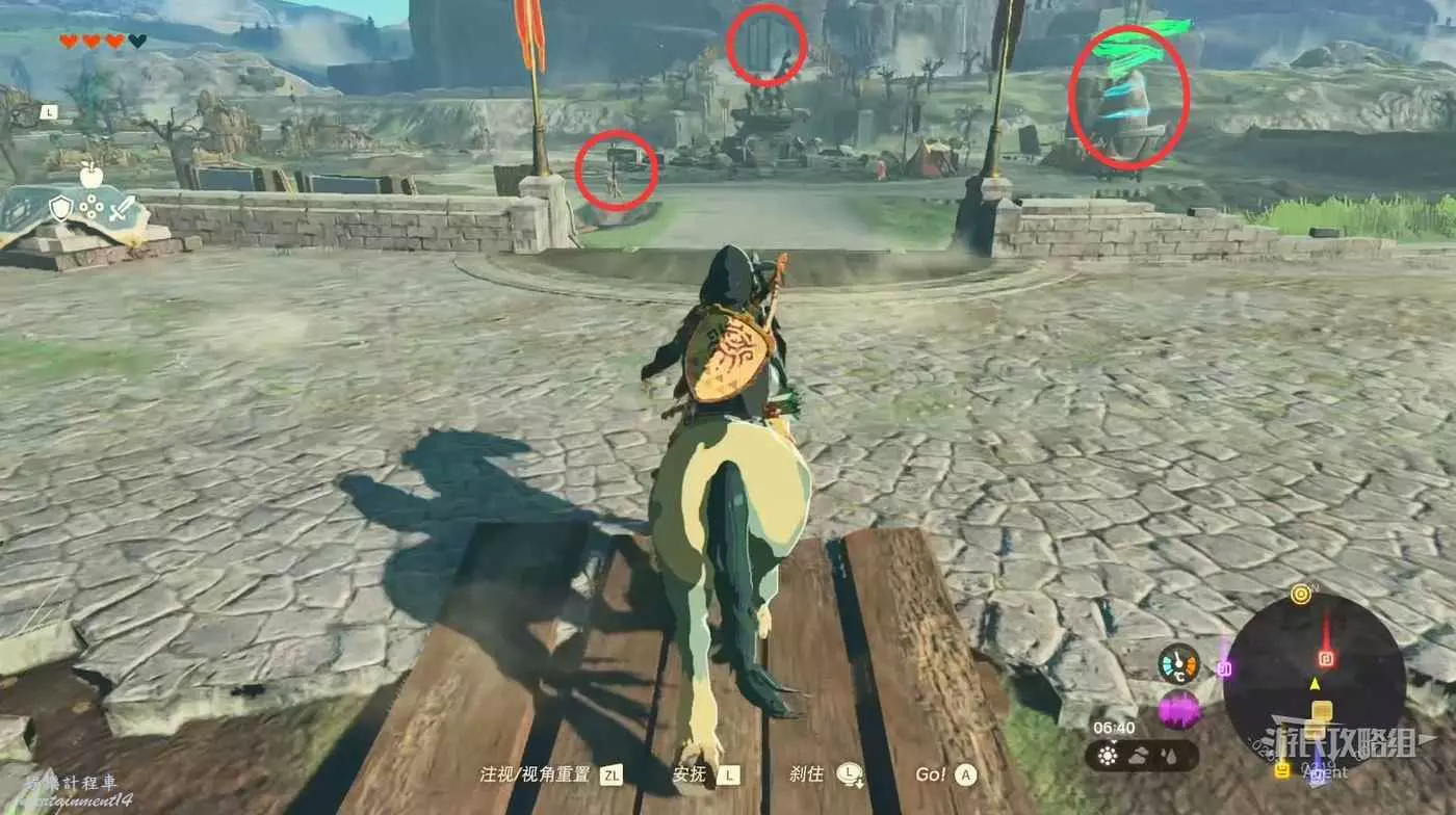 往北走來到海拉魯城邑遺跡,路口有個人在立牌子,右邊有個神廟,打開面前的門穿過護城河可抵達三殿。帳篷裡可以撿到些武器,中央廣場正中間的石頭下面有個呀哈哈。