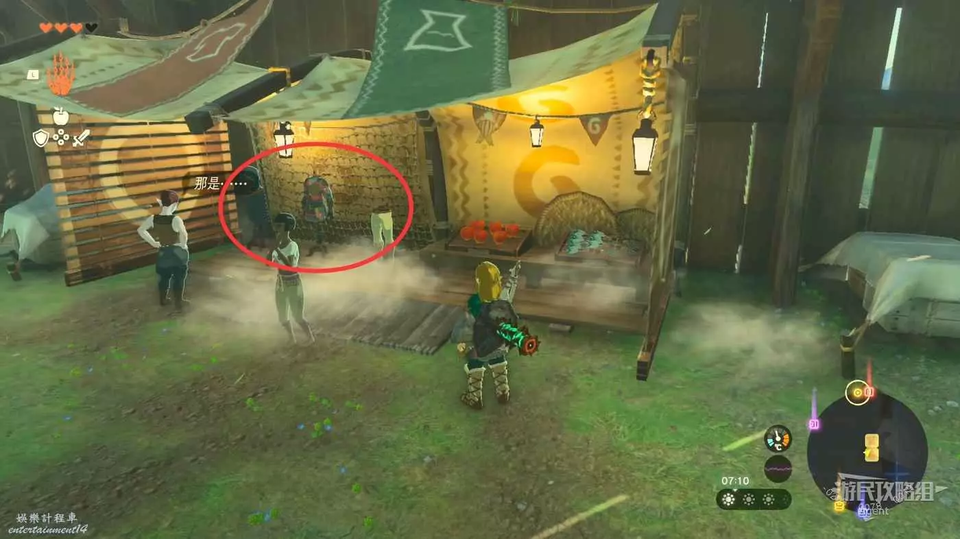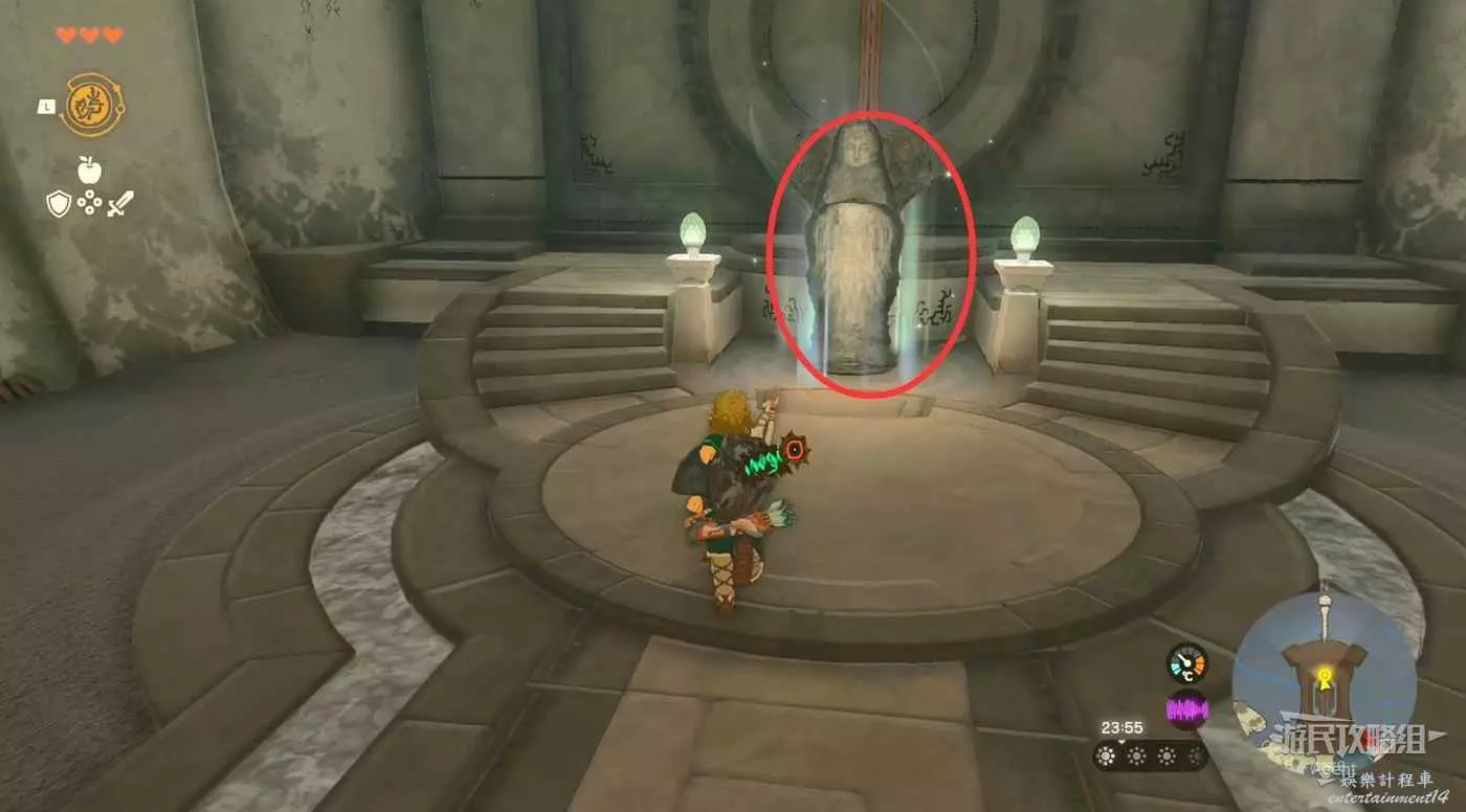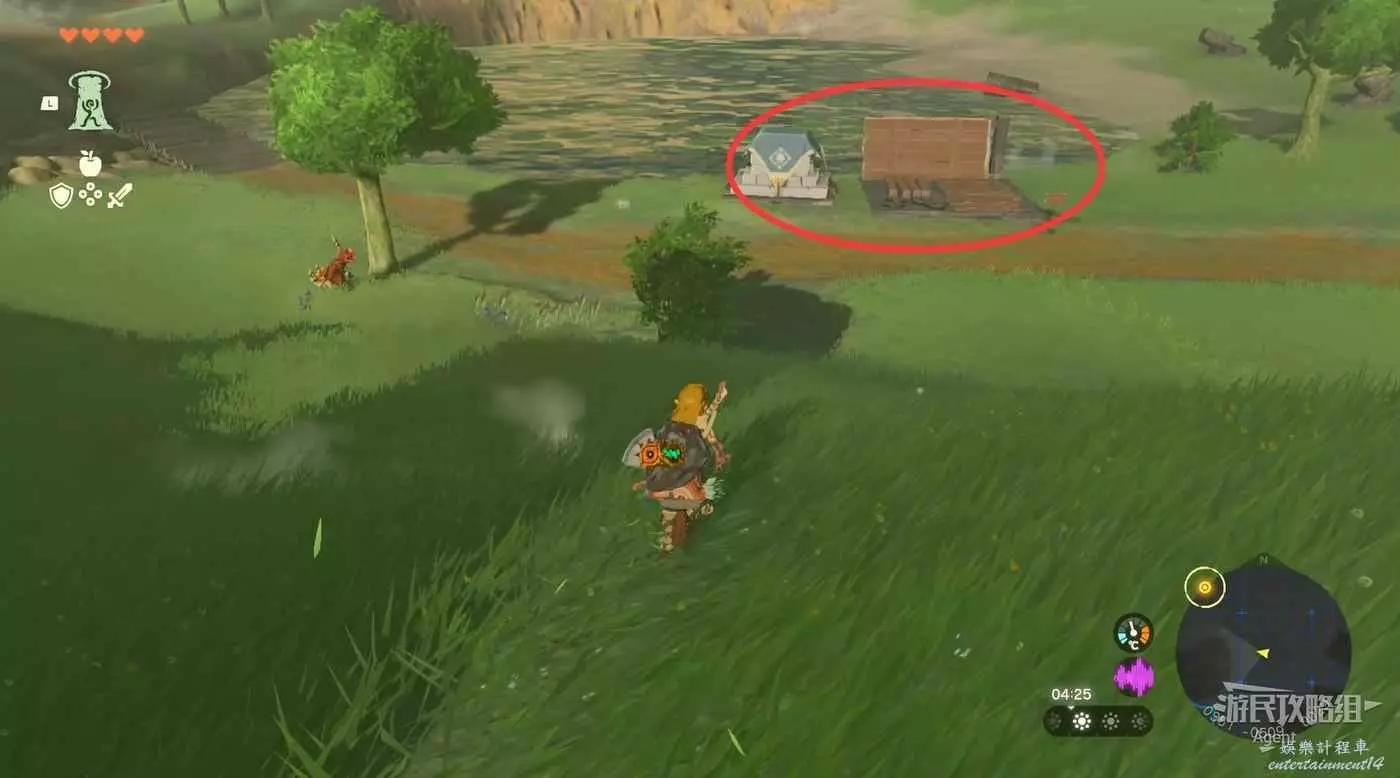 往北走來到海拉魯城邑遺跡,路口有個人在立牌子,右邊有個神廟,打開面前的門穿過護城河可抵達三殿。帳篷裡可以撿到些武器,中央廣場正中間的石頭下面有個呀哈哈。