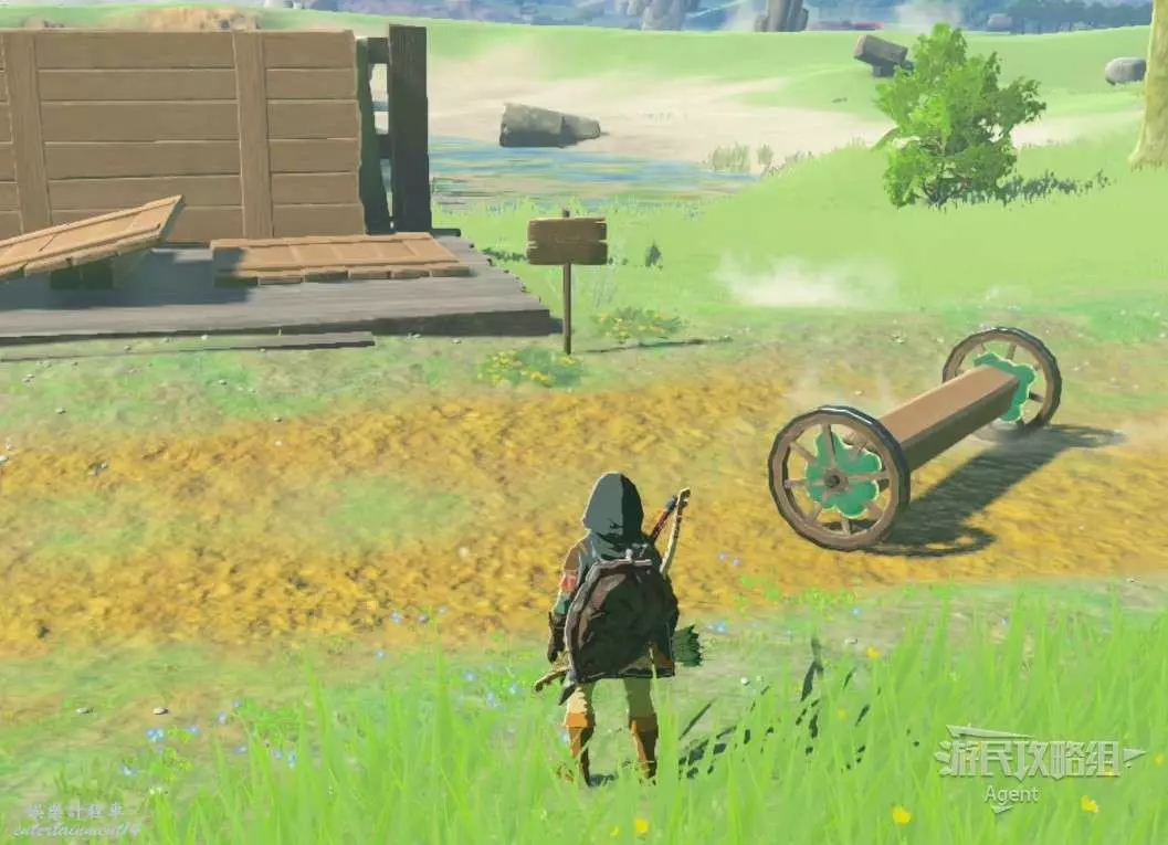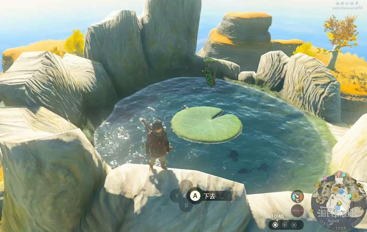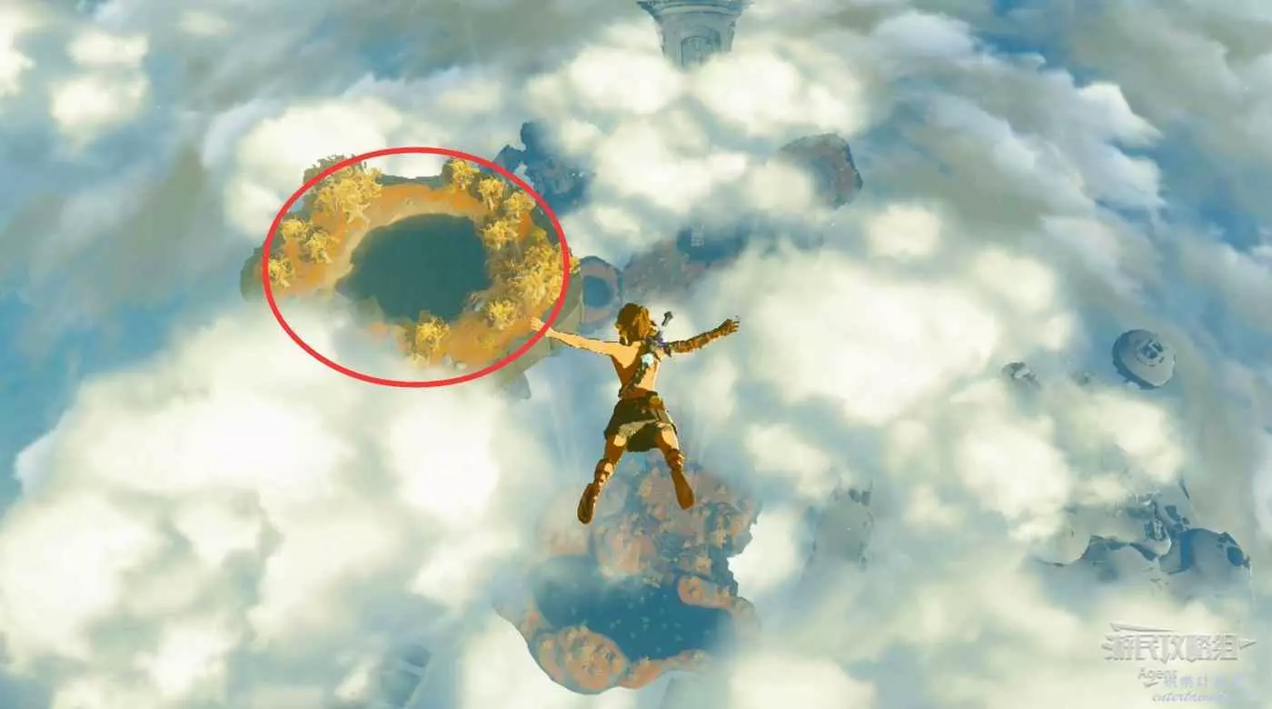 往下跳,離開初始空島來到地面,落入中央海拉魯的無底池塘。從池塘往監視堡壘方向走。