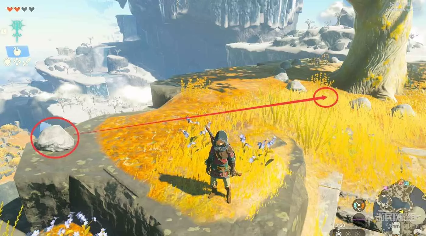 初始空島上還有幾個類似的漂浮島嶼,都可以滑翔過去看看。比如不遠處就有個島,把石頭放到石環上的缺口處發現呀哈哈。還有前面提到的,雪山上之前上不去的高地,也可以滑翔過去。