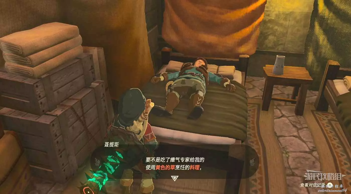 下來避難壕,有床可以睡覺,旁邊床上的人提到的黃色的草就是向陽草,做出的料理可以治療地底瘴氣帶來的傷害。