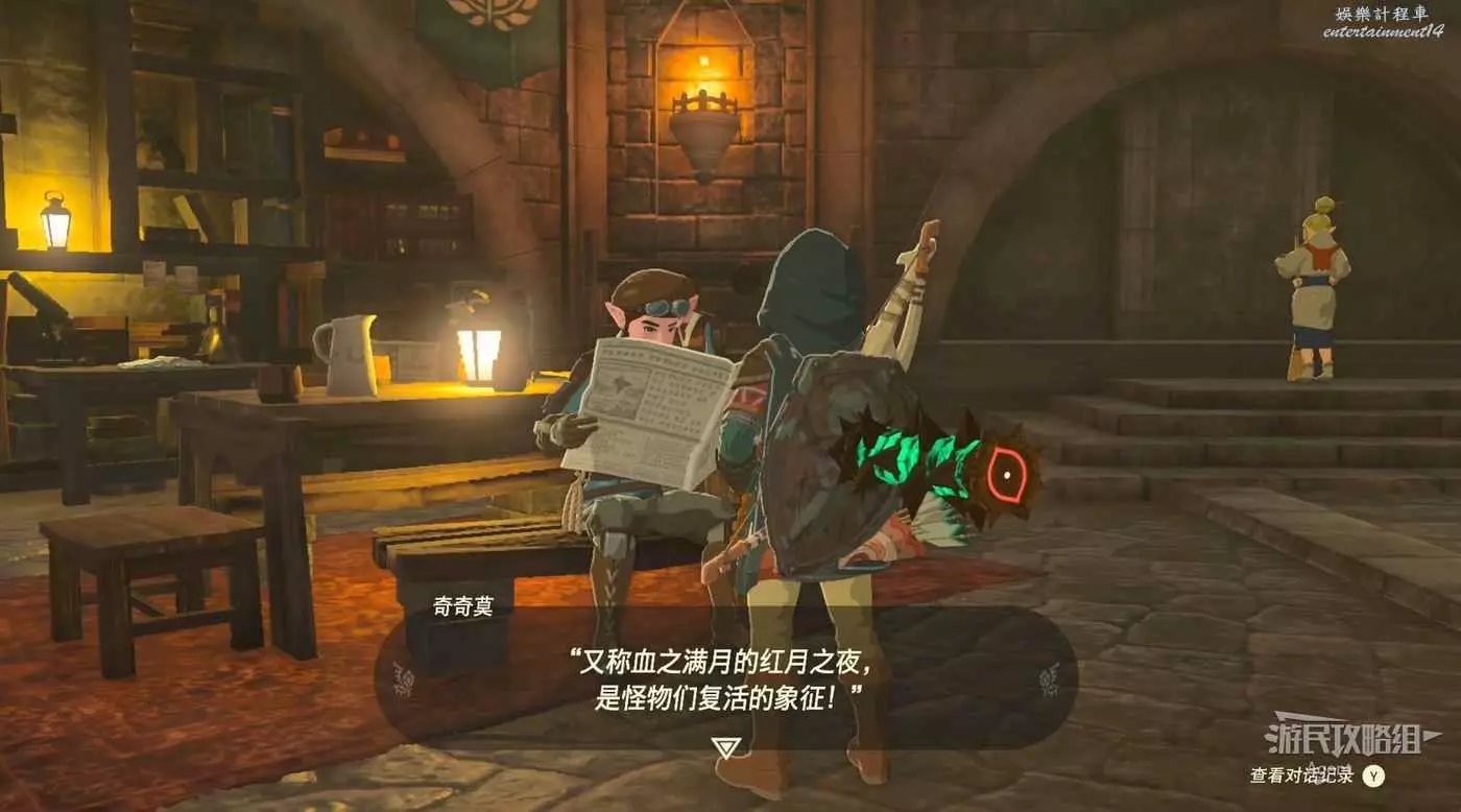 與看報的NPC對話,得知血月後怪物們會復活。這裡也有幾人提到:西北方的海布拉地區以及利特村有大寒潮,注意保暖。