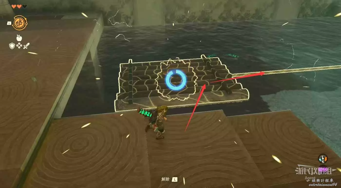 第二個溝更寬,需要更長的石板。把兩個石板粘合起來,搭橋過去。如果在粘合過程中操作失誤,導致粘錯位置了,使用究極手時擺動右搖杆即可解除連接。