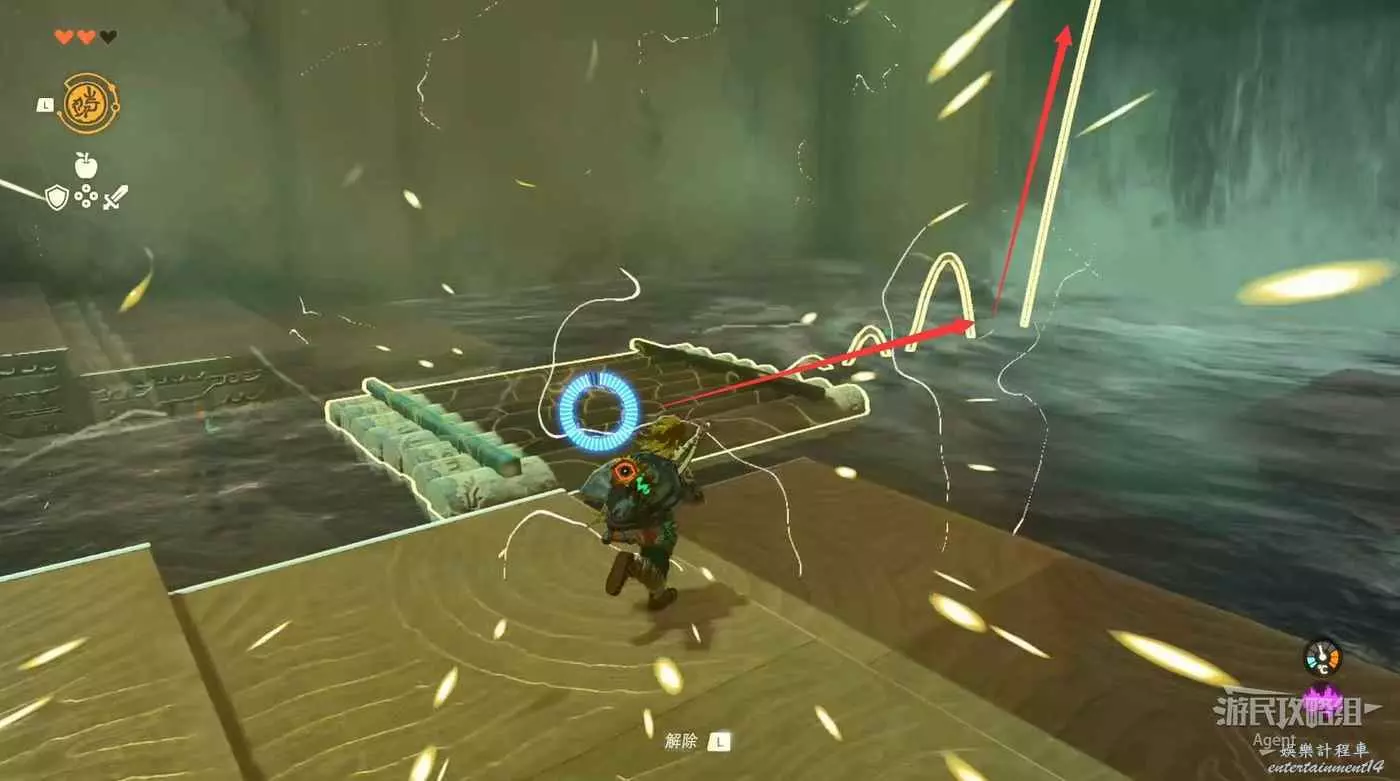 然後將鉤子掛在鐵軌上,跳上木板滑下去,雕像前獲得祝福之光。