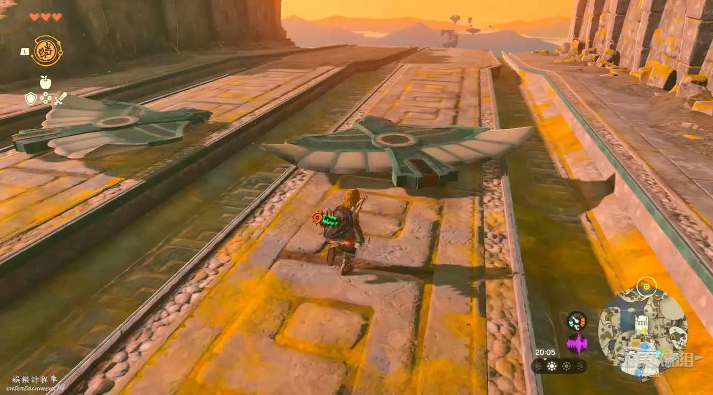 往前走見到滑翔軌道和勞魯。通天術上去有個左納烏裝置製造機。移動方形平台到那邊島上有寶箱。