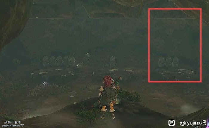 蠻族衣服這個地方,進洞後靠左貼牆走有一塊地方被礦石蓋住,下面必有炸彈花,旁邊有兩個杆子大概就這個形狀