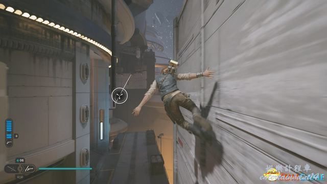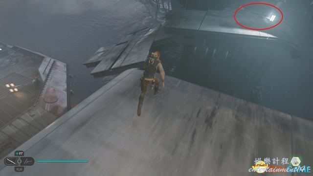 主線路上會經過的連續蹬牆跑位置,不要勾上滑索,直接下落到下方平臺。