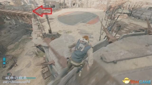 之前進入建築物的位置,蹬牆跑後跳到橫杠擺蕩至前方。