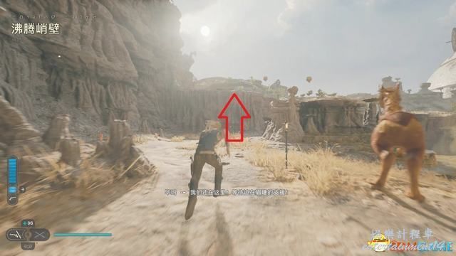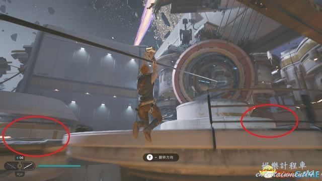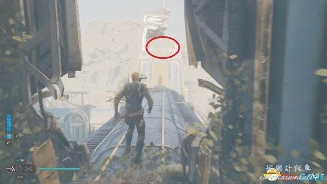 抵達下圖位置後,清理敵人並呼喚建築右側的奈寇,騎乘二段跳抵達上方。