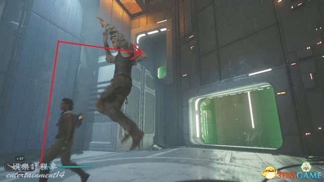 利用BD的技能,從二樓延伸至一樓機關位置附近即可進入綠幕。