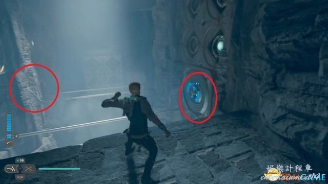 進入建築物內,中間標記是迴響,拉動右側開關呼喚奈寇進來,之後利用奈寇跳到上方,安置開關即可開門。