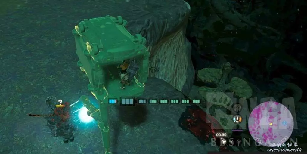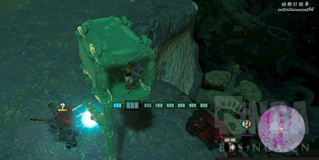 然後跑回到能通天的位置,將人馬勾到探測頭感應範圍,近一些也可以,高度原因人馬衝鋒過來不會銜接吼叫,但是如果玩脫了他會在你通天之前進入吼叫姿態那沒辦法,不過那種基本是距離太太近還沒通天的緣故,距離差不多就可以了,人馬近身一定是有個衝刺動作,pose擺出來了直接通就完事。