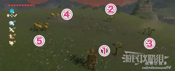 開局即可開始收集呀哈哈,但背包擴充要等到降落在地面之後。拿到滑翔傘後,從「監視堡壘的鳥望台」往西北方向飛,完成一個非常簡單的伯庫林事件後即可擴充背包。擴充完前兩次之後,伯庫林會移動到監視堡壘,監視塔區域東南邊。