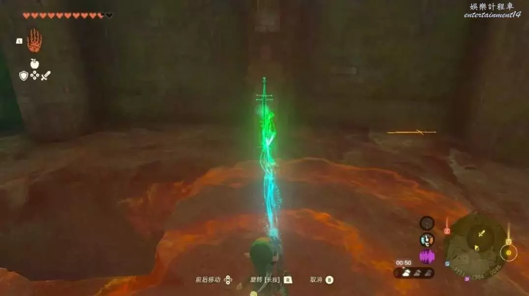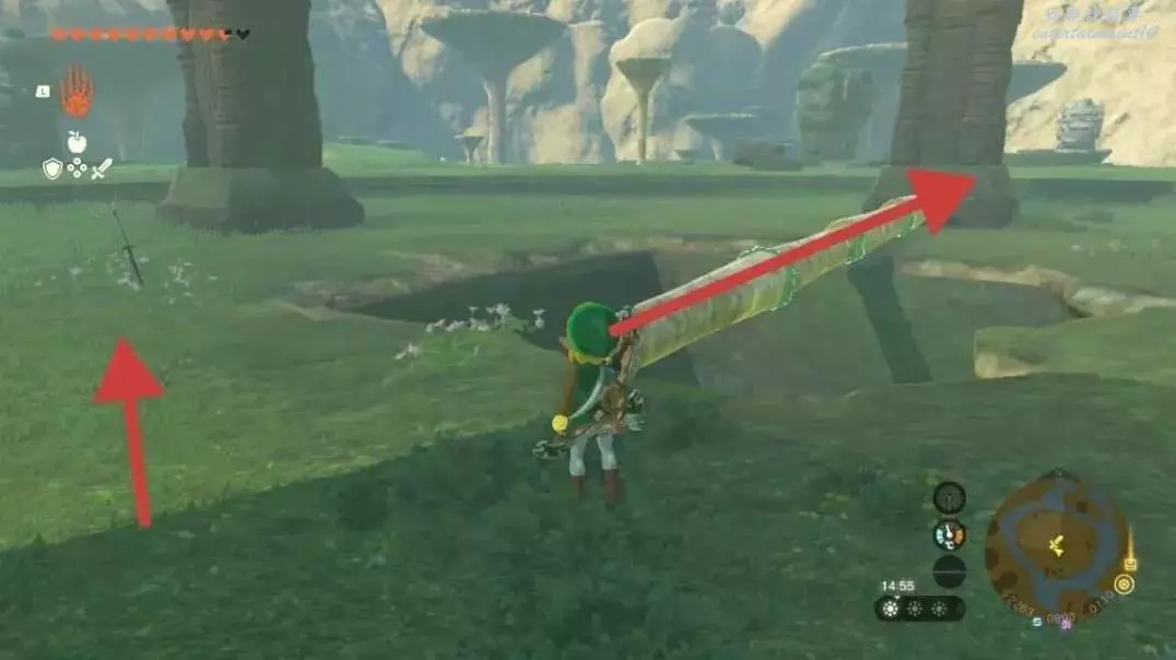 四根石柱的中間,有塊明顯的凹陷,在這裡砍四根樹木,拼成一個長條,像我一樣擺在這裡,右邊的劍可當方向參照