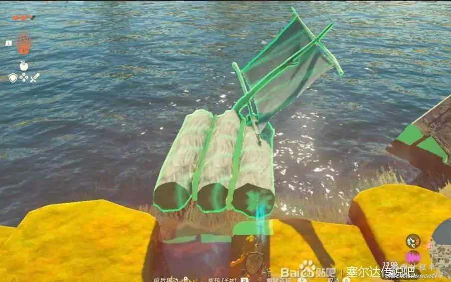 穿過洞窟這把又是一個湖區,但是這裡沒有了風,所以需要自己搭建一個快艇,NPC會教你如何使用,簡單一點的話就像這樣樹幹+2個風扇,組合好以後上去敲打一下就能出風帶你過去了。