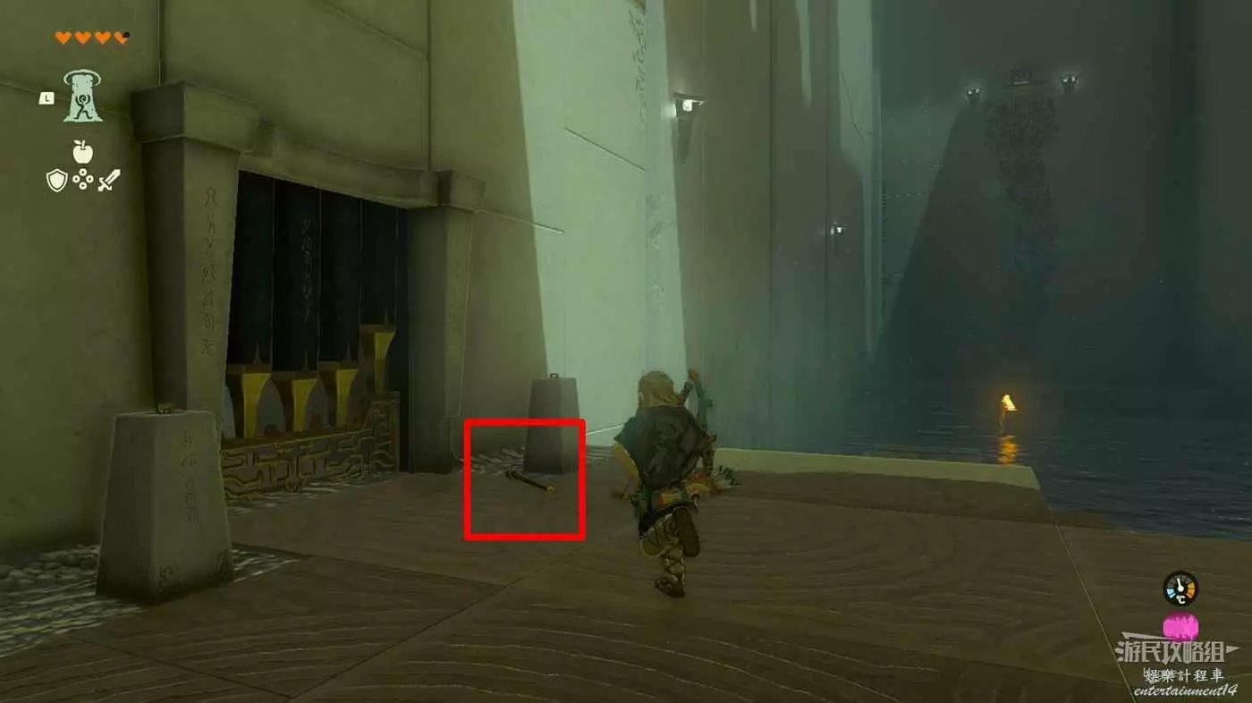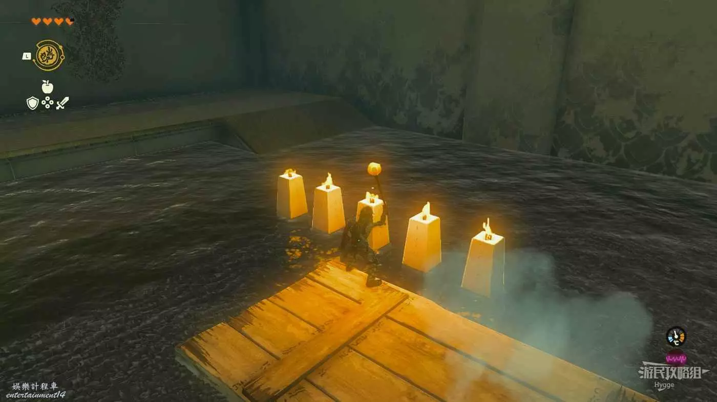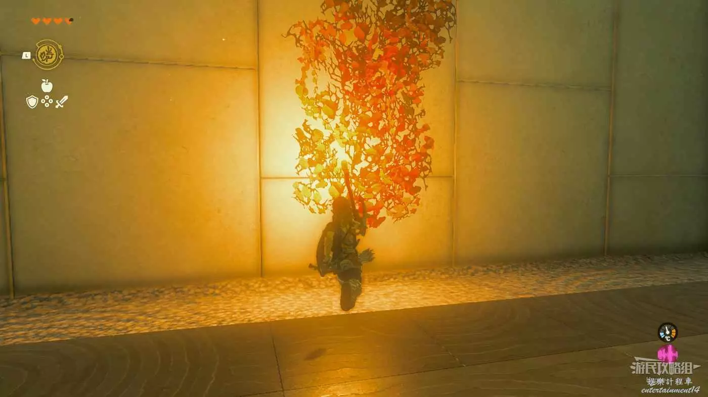 隨後利用倒轉能力再次搭乘木板回到來時的區域,途中再次利用火炬樁點燃火把。