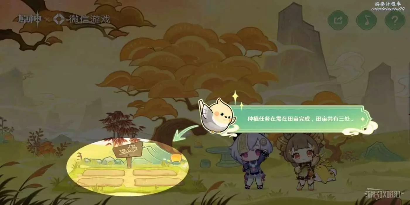根據教學種完第一畝田後,橫滑螢幕還可以找到另外兩畝田,種田時需要等七七和瑤瑤跑到田邊完成種田的動作才能成功種下,中途不要退出遊戲,否則需要重新播種(未成功種下的種子會返還)。