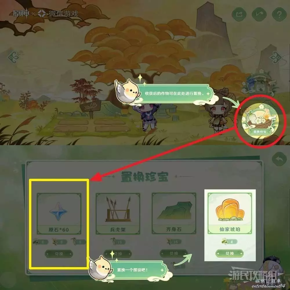 種植完畢並收穫作物後,通過右下角的「置換珍寶」可以兌換原石。除了原石之外都是本活動頁面中的擺設,並非原神遊戲內道具。喜歡做手賬的小夥伴可以考慮體驗一下哦。