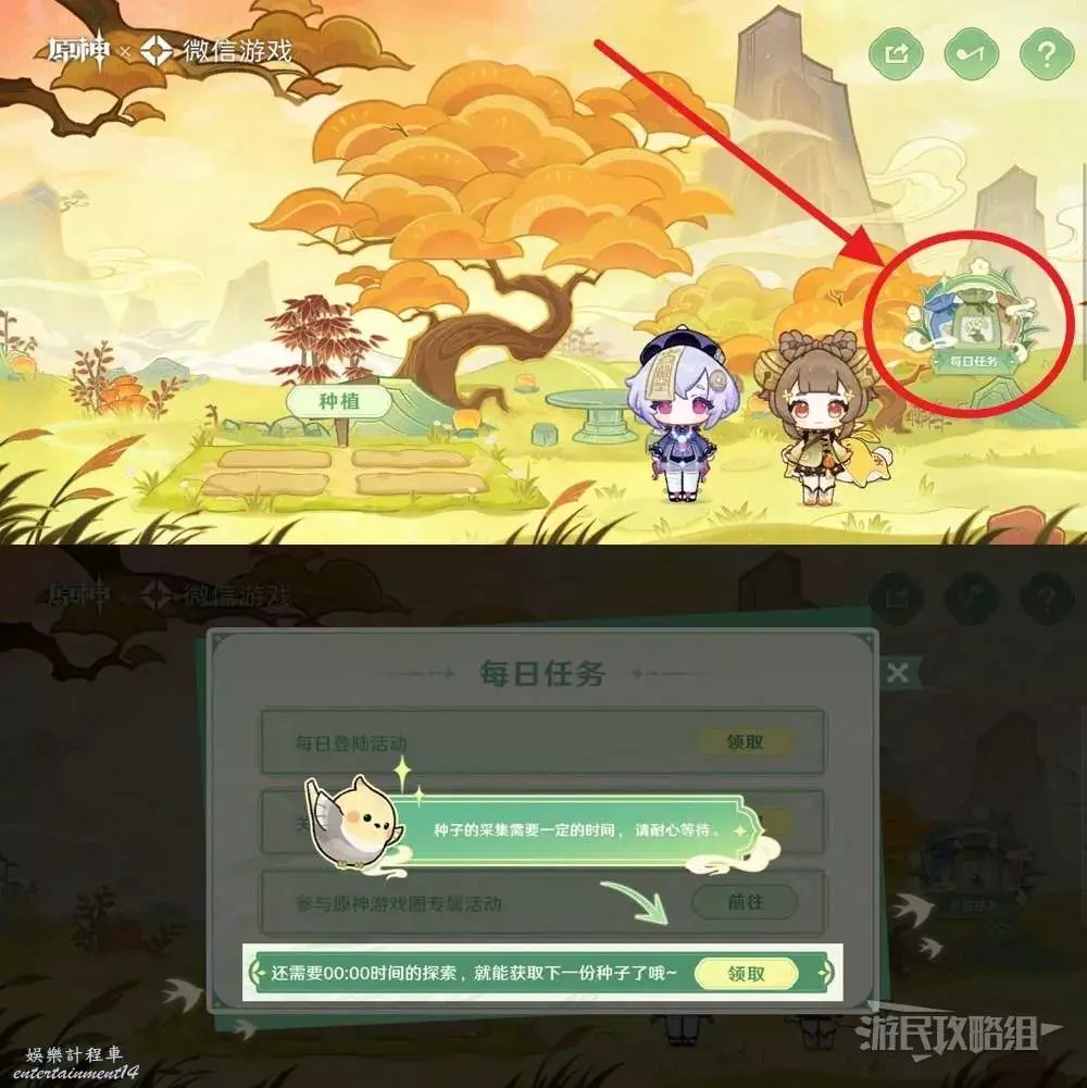 種子需通過採集獲取,每1分鐘可在「每日任務」中手動採集一份,完成「每日任務」中的指定任務則可以獲得更多種子。