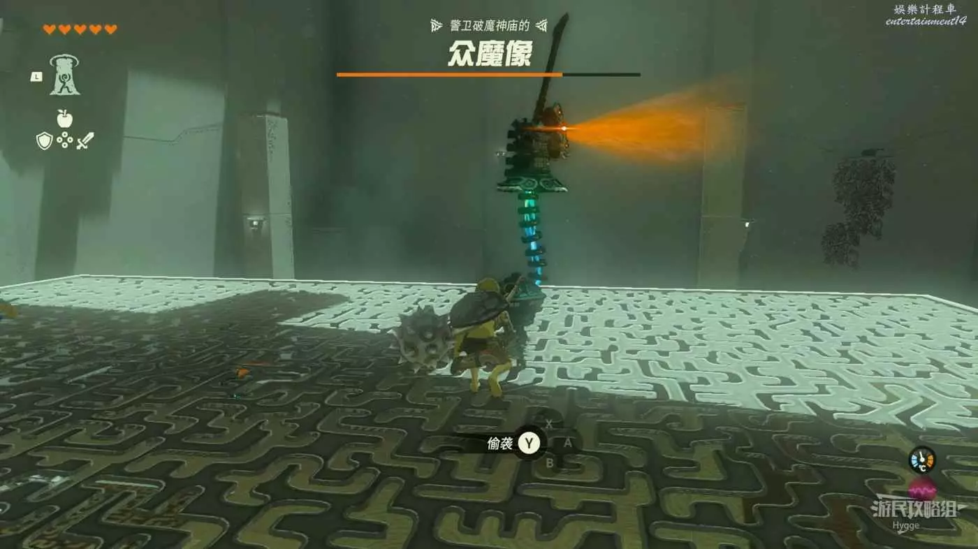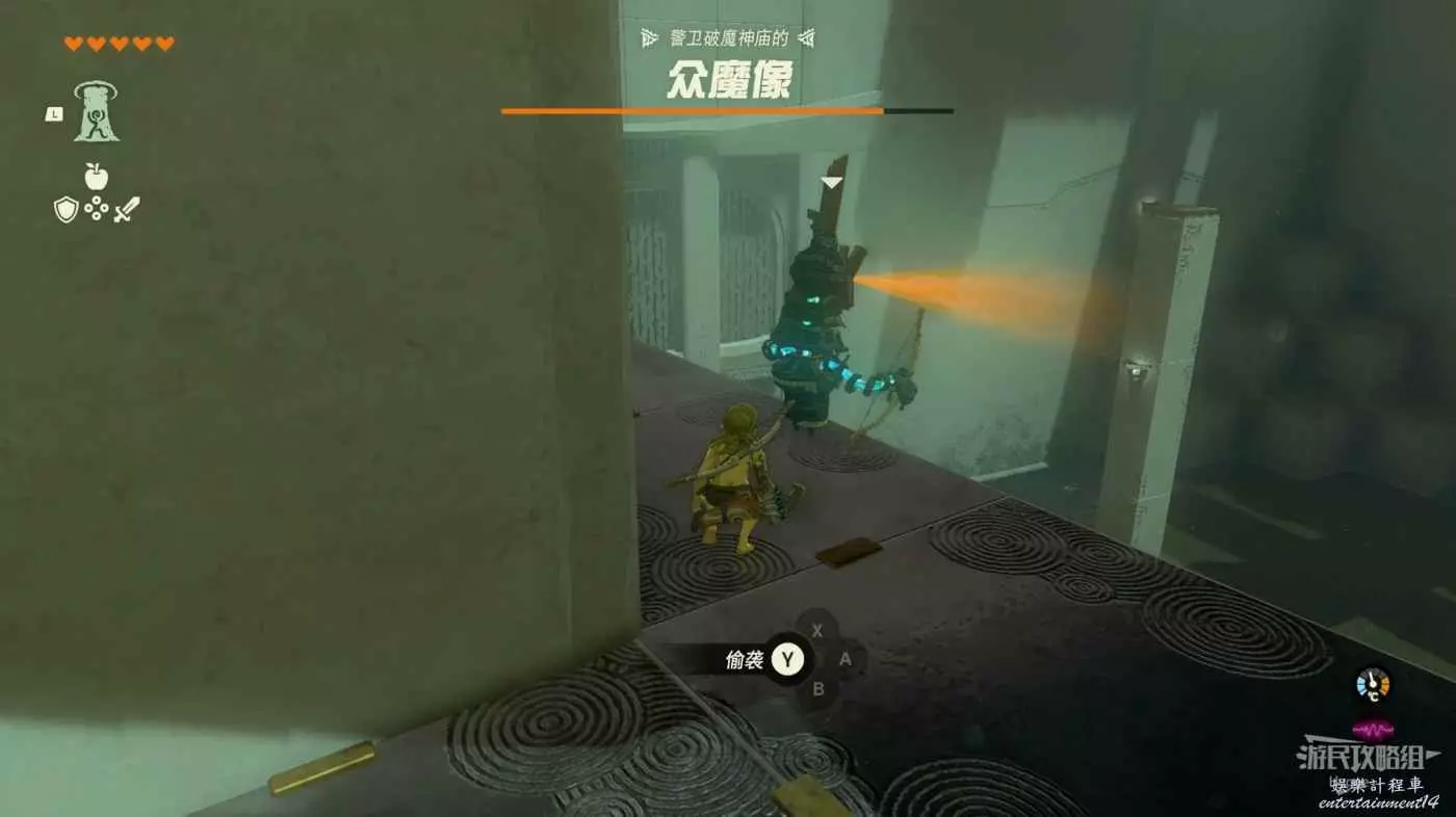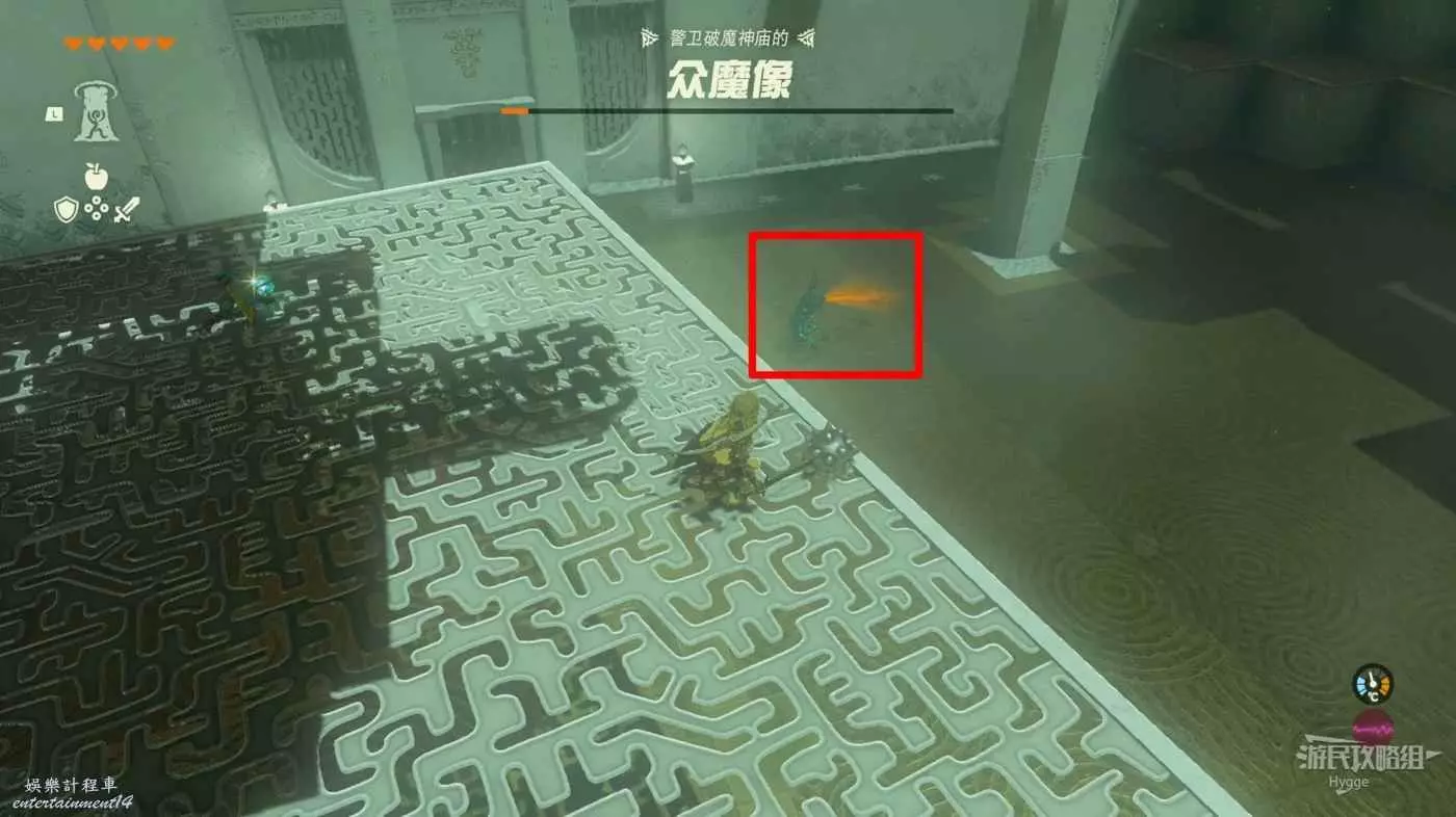 該神廟為禁止使用自帶武器裝備和道具的孑然一身戰,在神廟入口左側可以拿到武器。