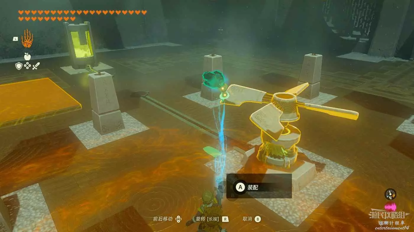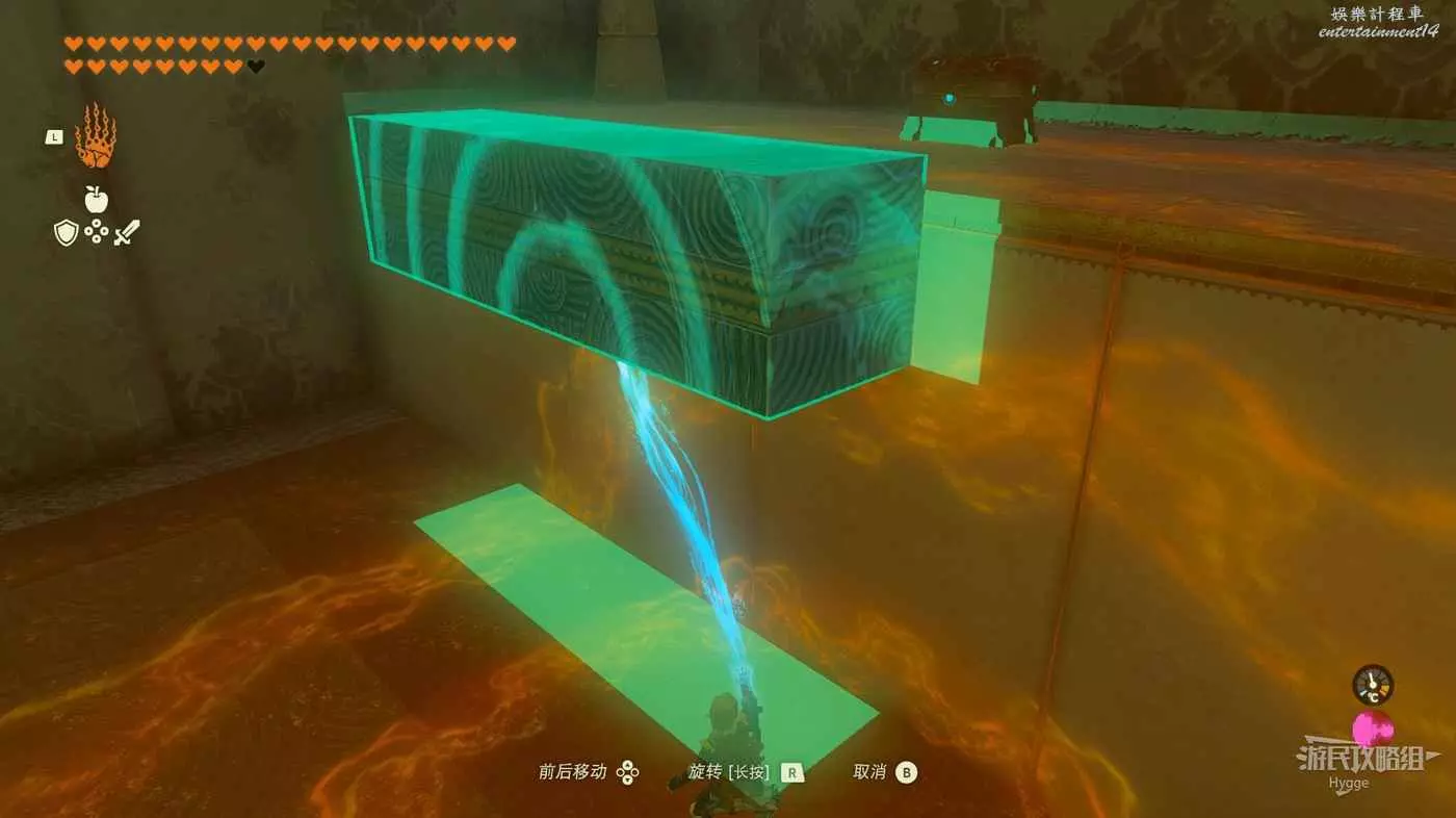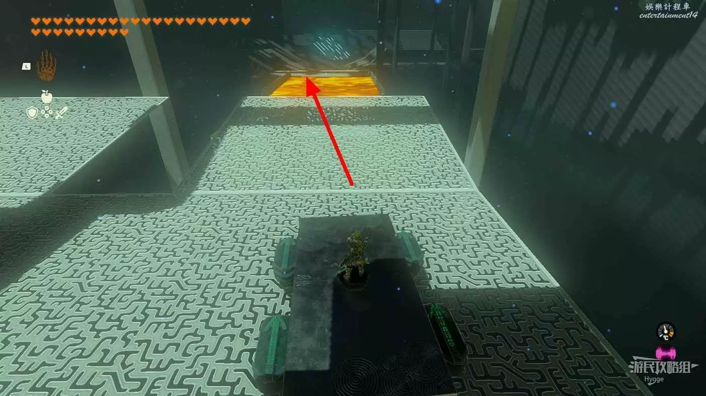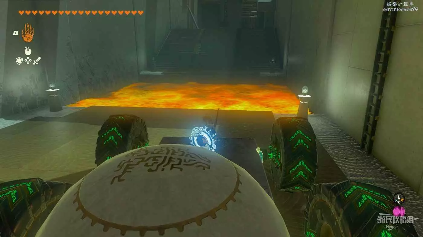 進入神廟後跳至下層,將大石球安裝在板車上啟動板車穿過岩漿。