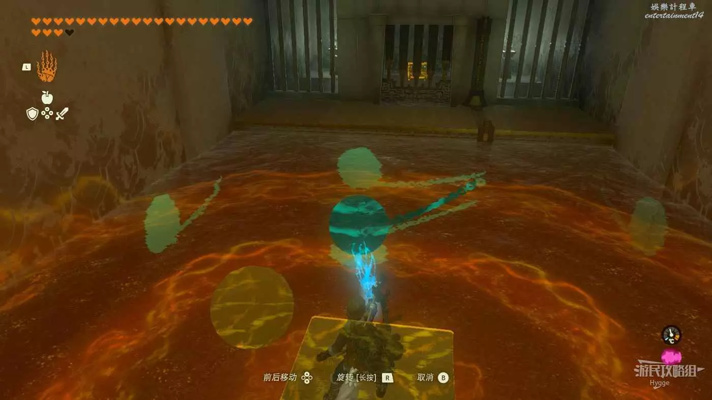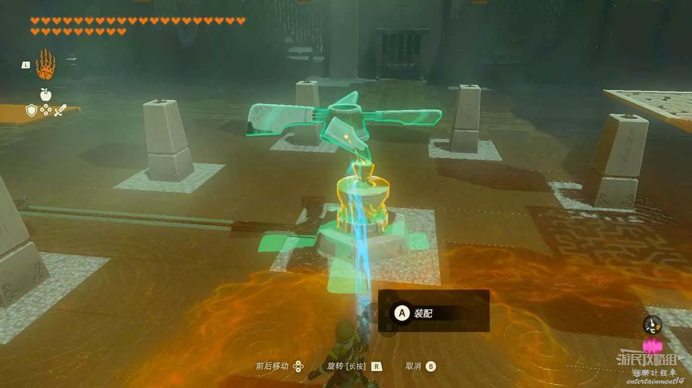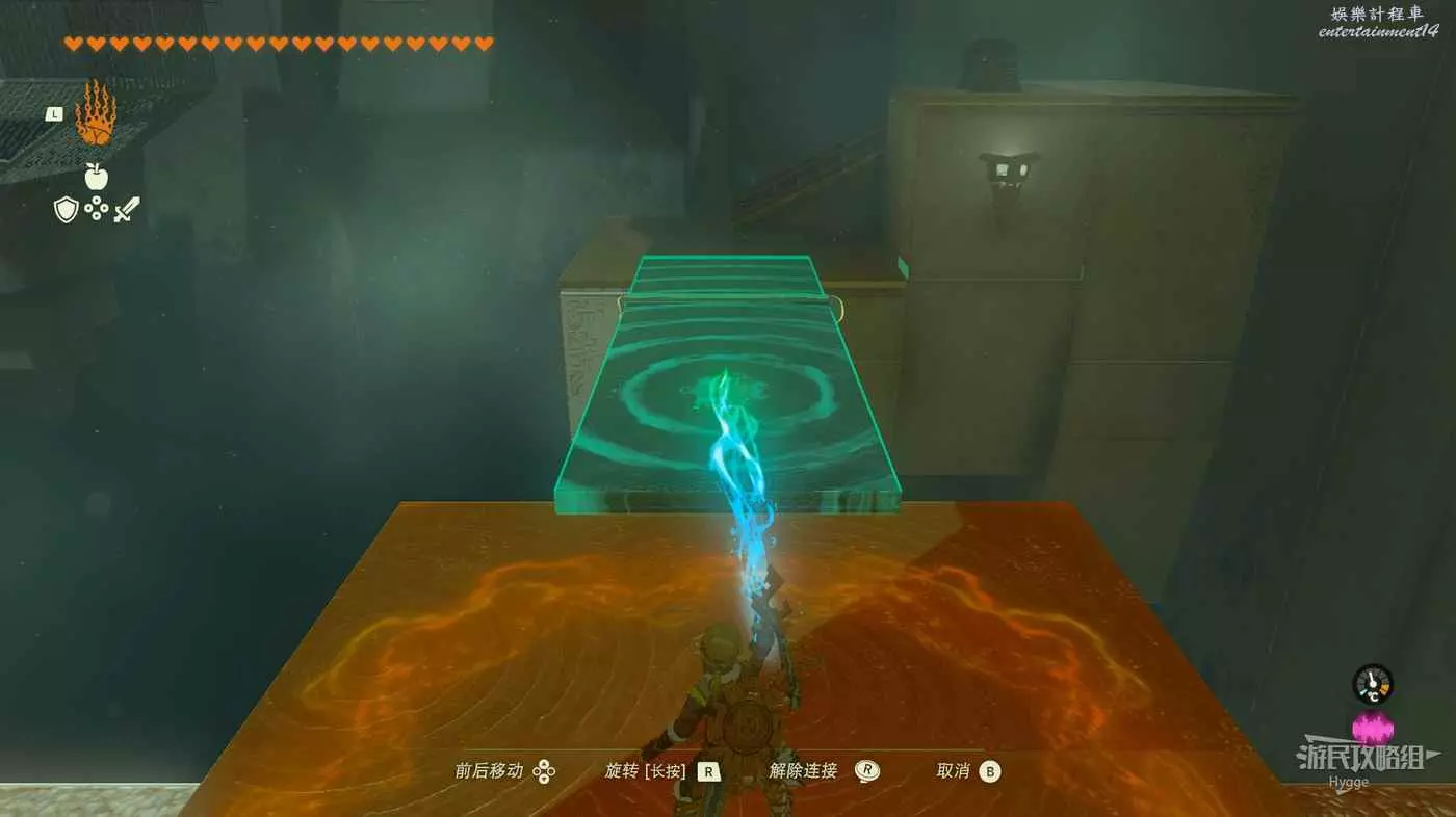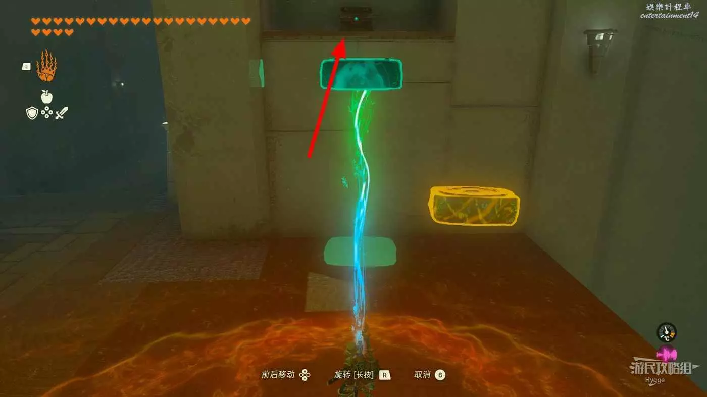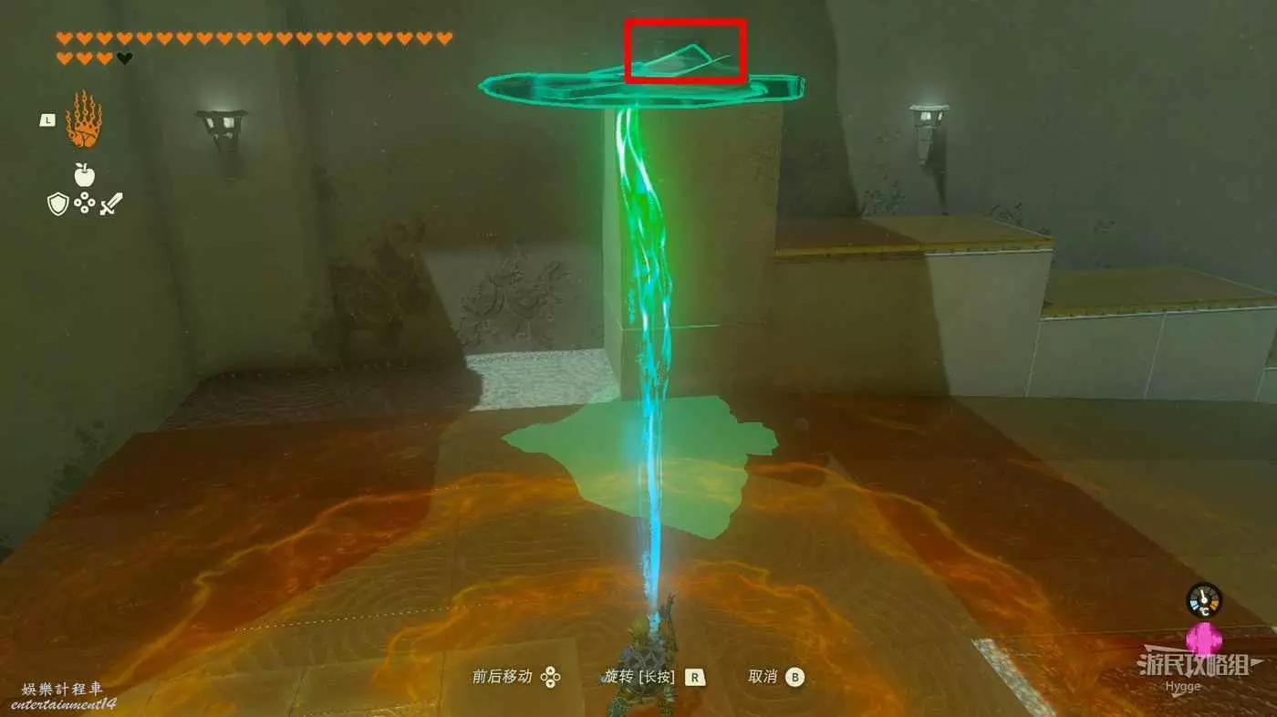 進入神廟後跳至下層,將大石球安裝在板車上啟動板車穿過岩漿。
