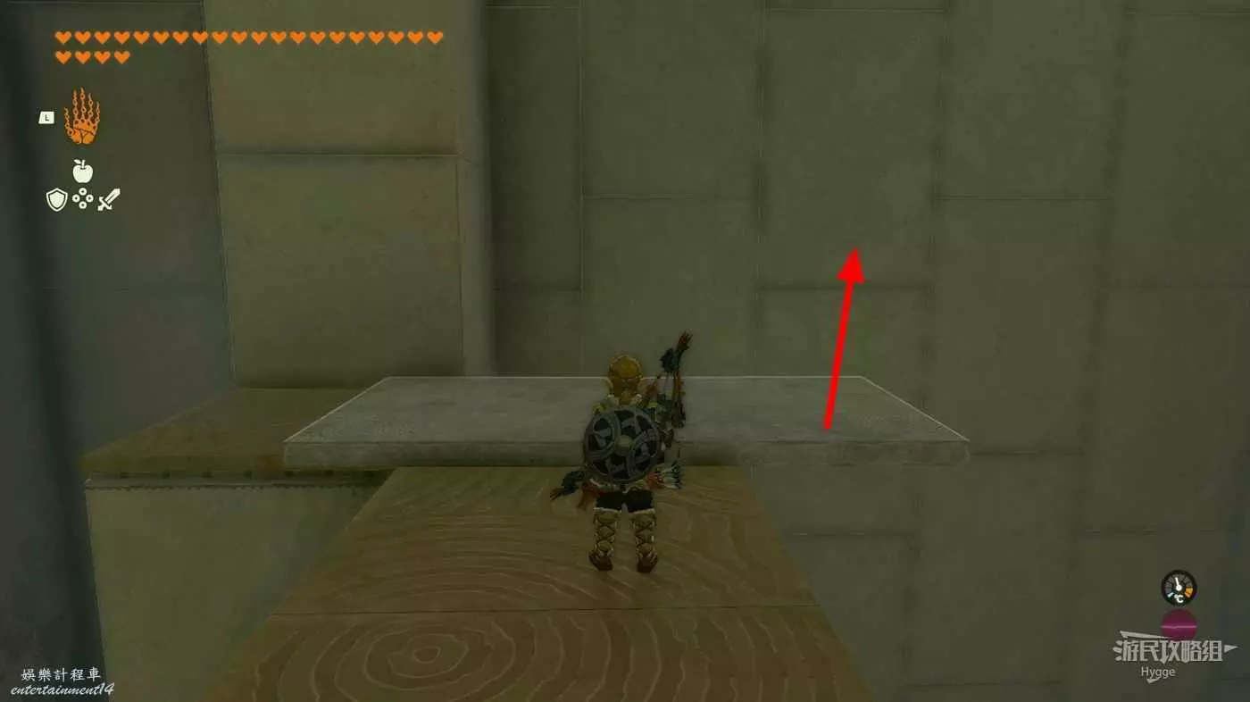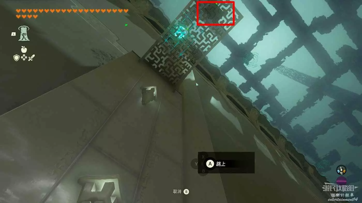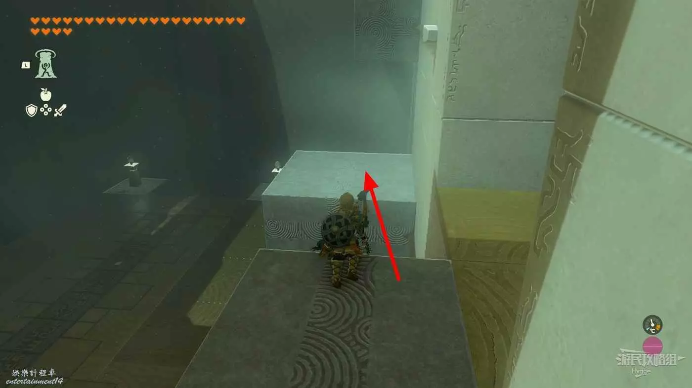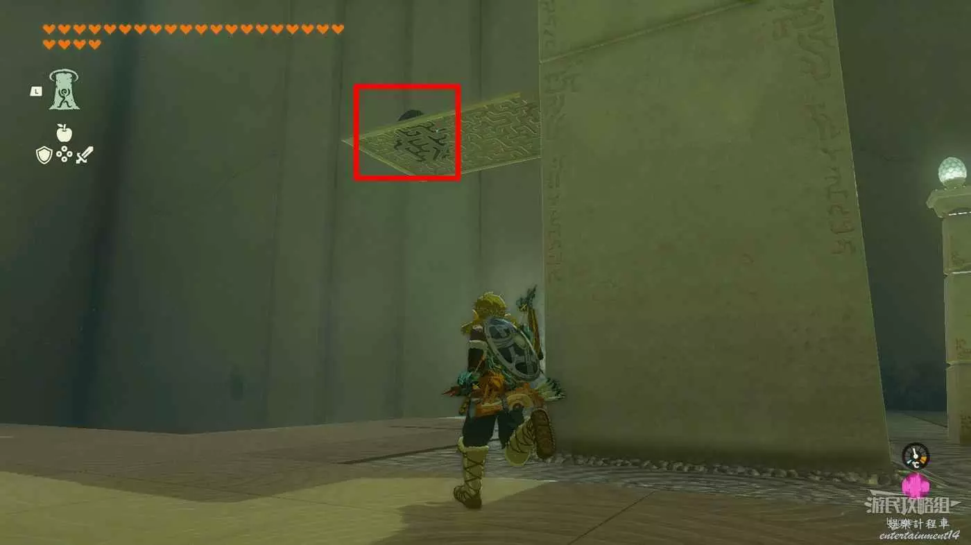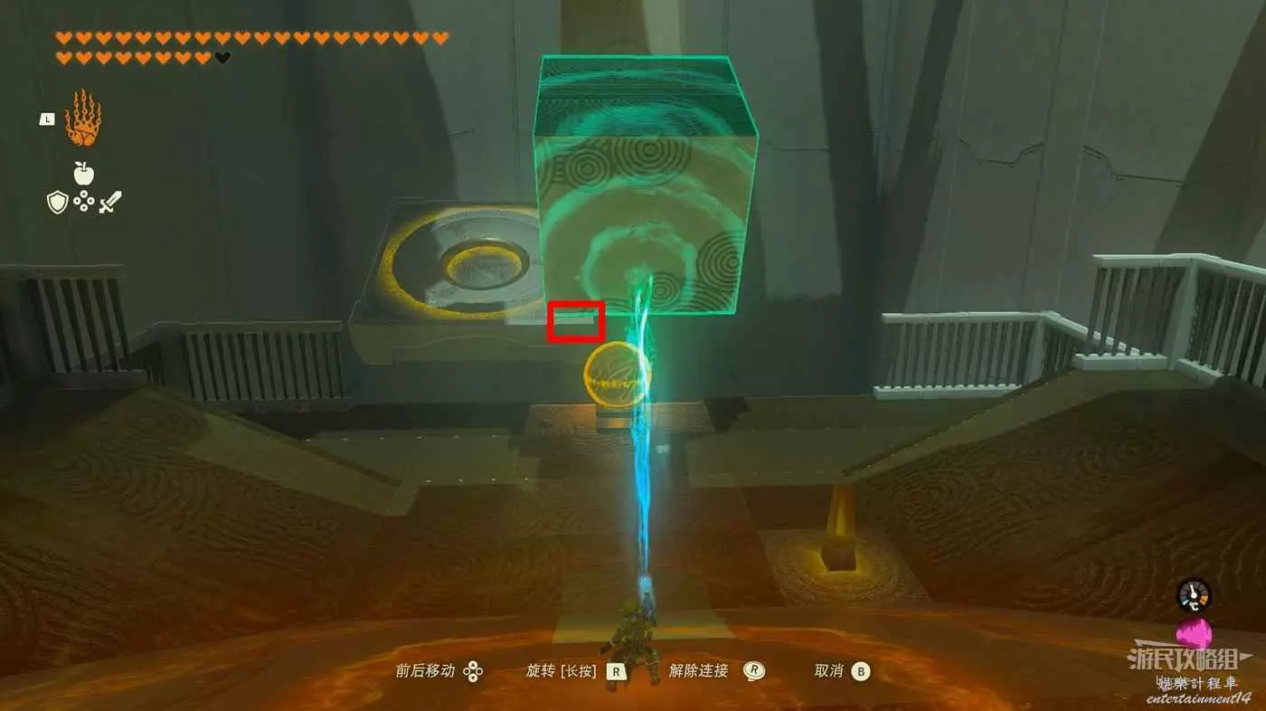 進入神廟後先來到左側房間,將大磚塊和上方的杆連結,隨後用究極手將其高高抬起。當前方的坑開始向右移動,並且下圖中標記出的平臺邊框即將與球平齊時鬆手。