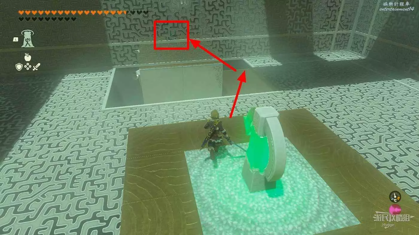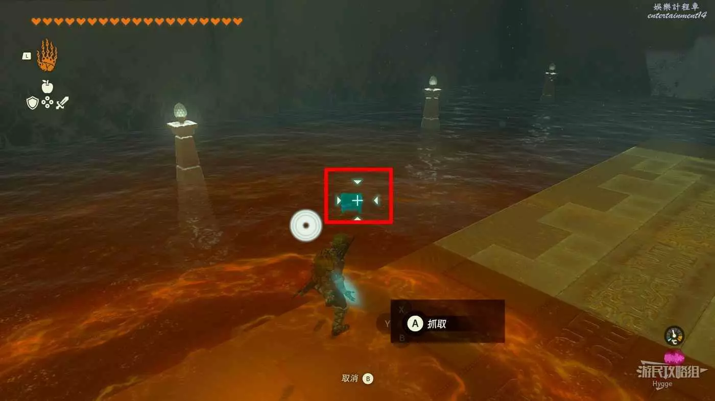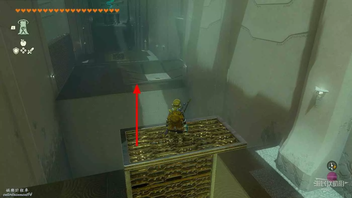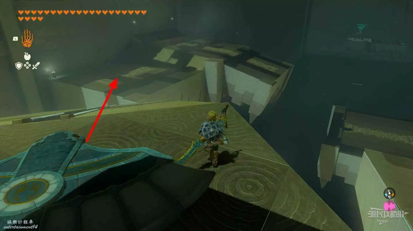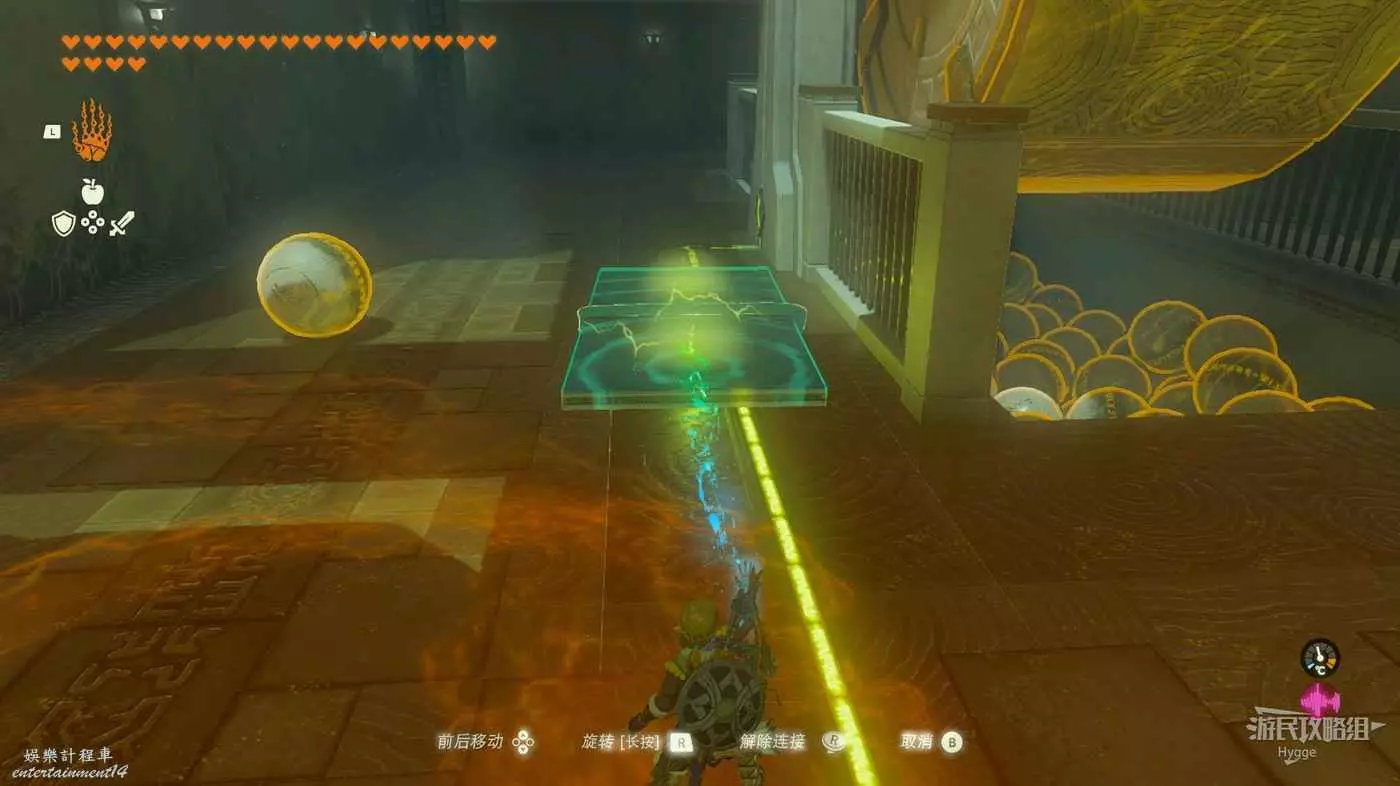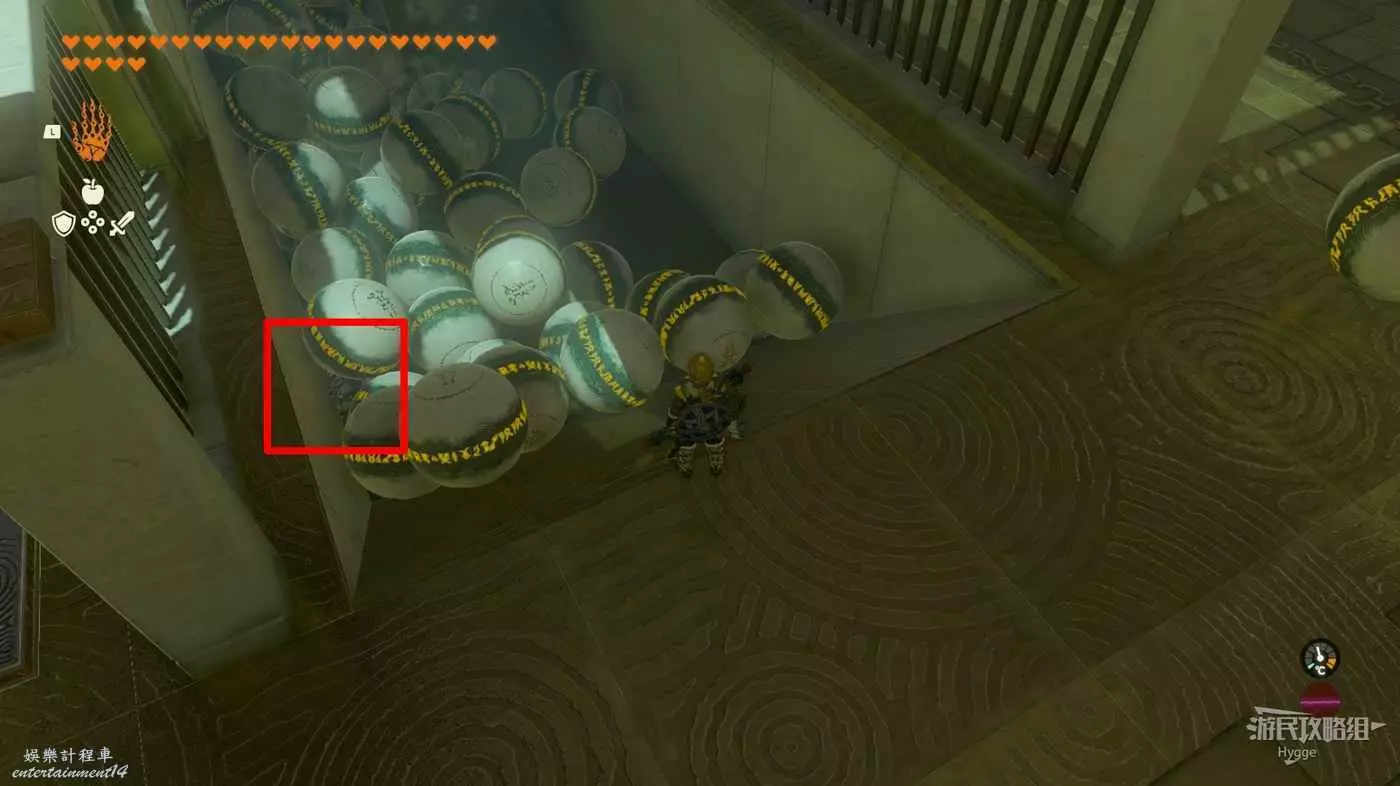進入神廟後先來到左側房間,將大磚塊和上方的杆連結,隨後用究極手將其高高抬起。當前方的坑開始向右移動,並且下圖中標記出的平臺邊框即將與球平齊時鬆手。