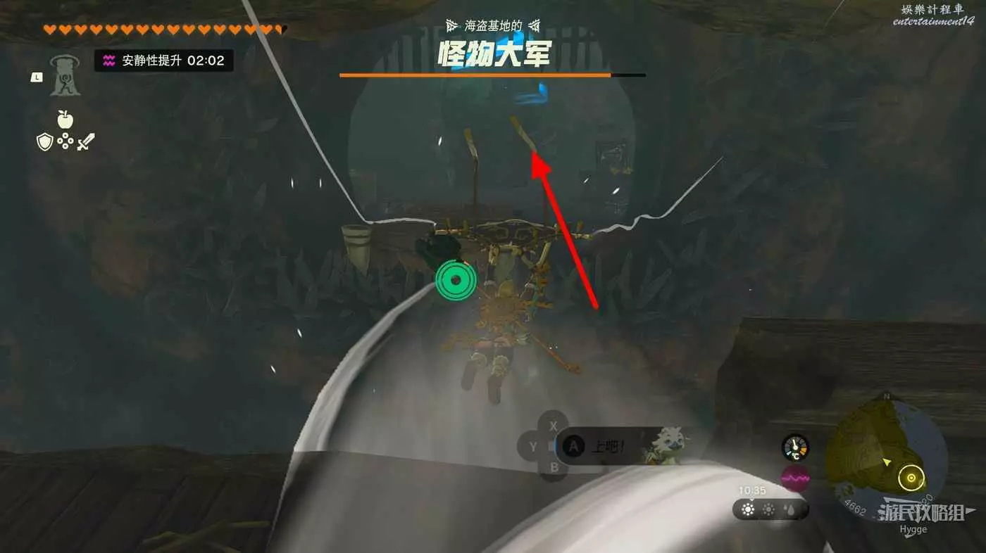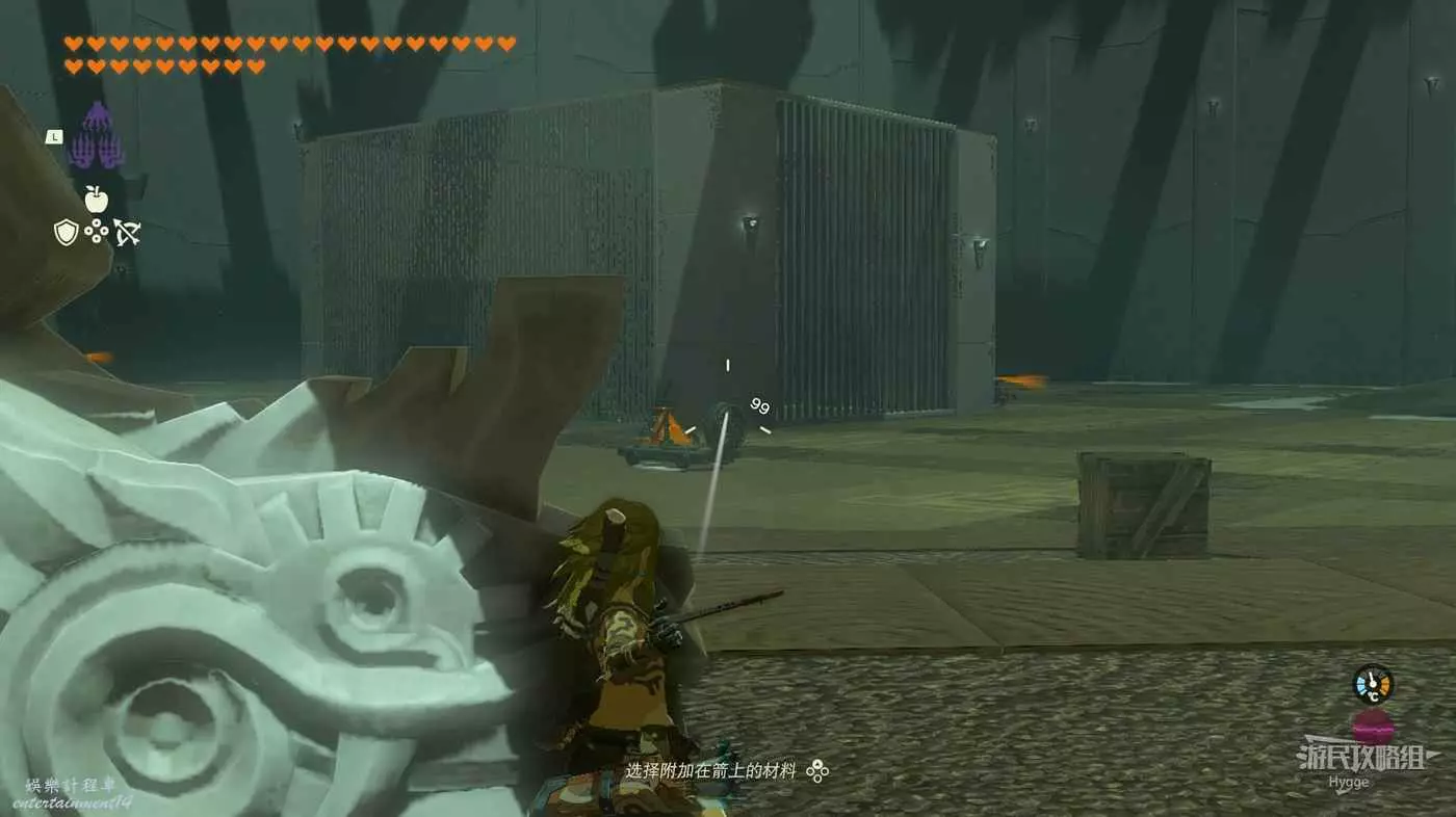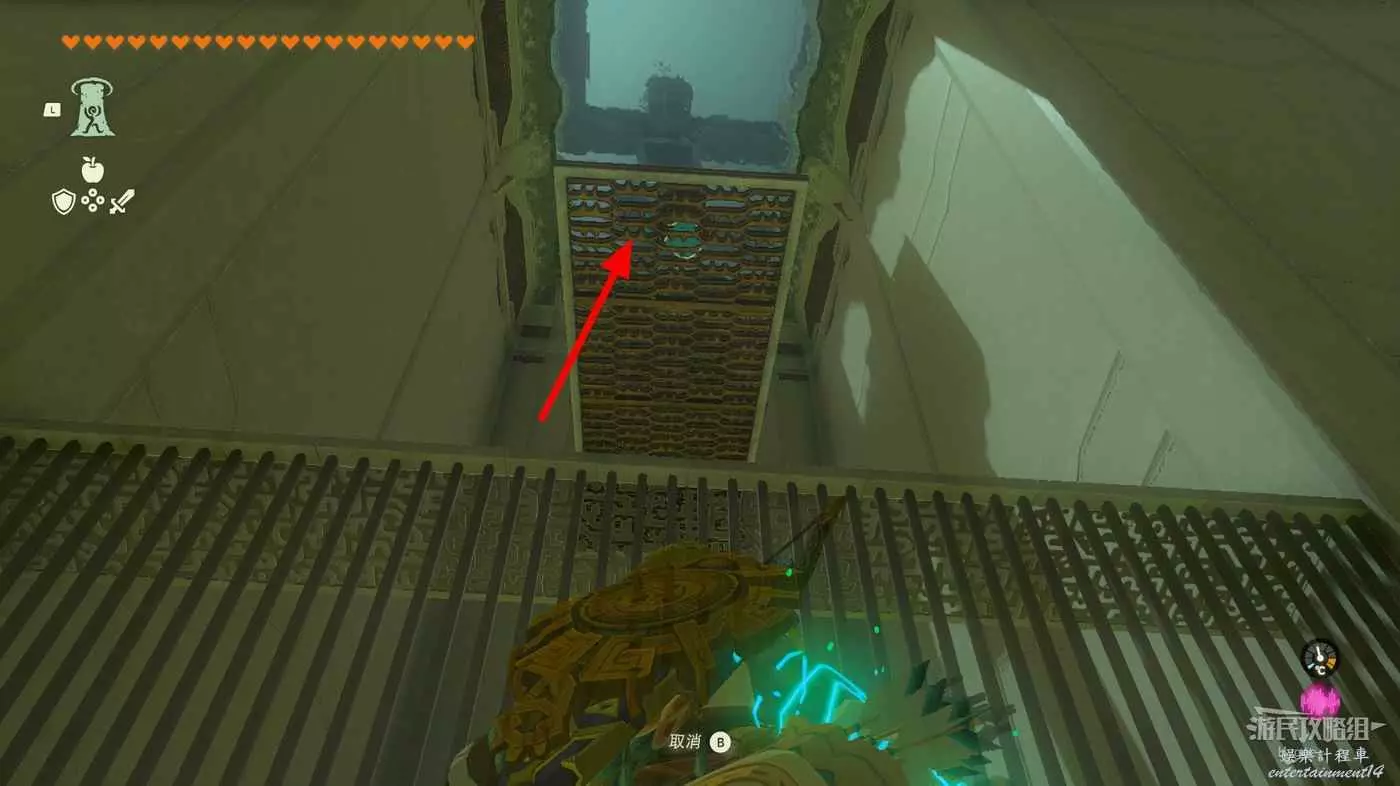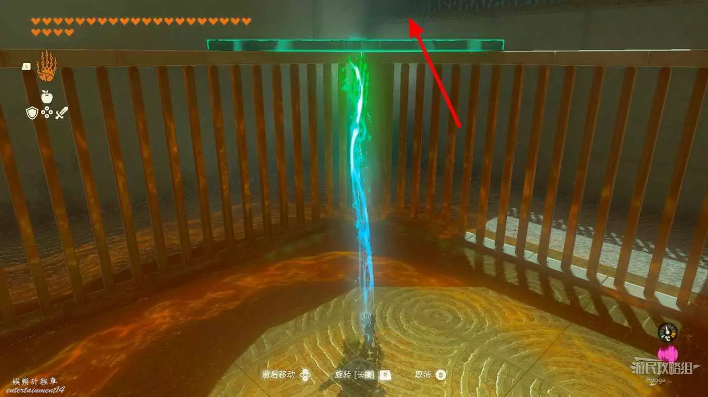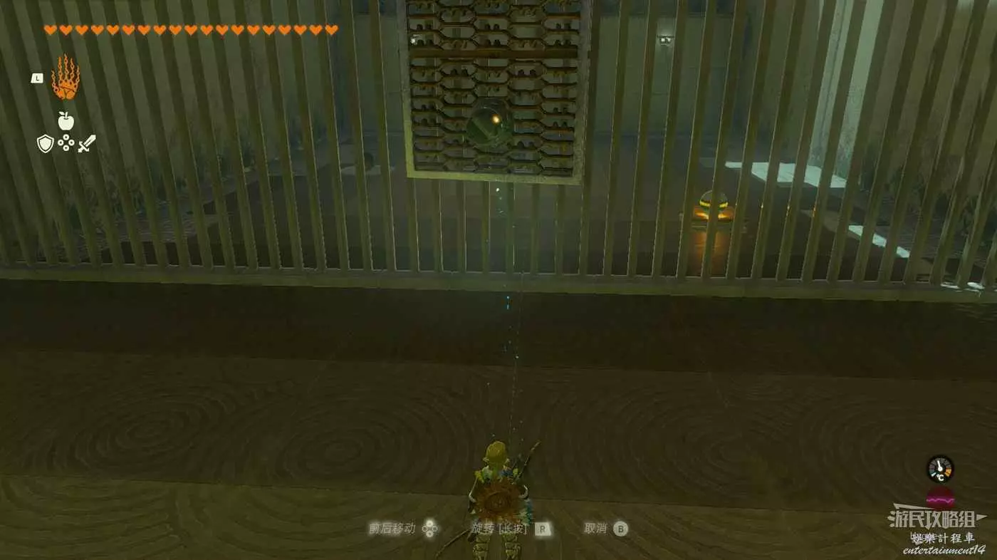繼續旋轉籠子使其恢復我們來時的狀態,隨後在籠子內使用弓箭射擊籠子外的開關。