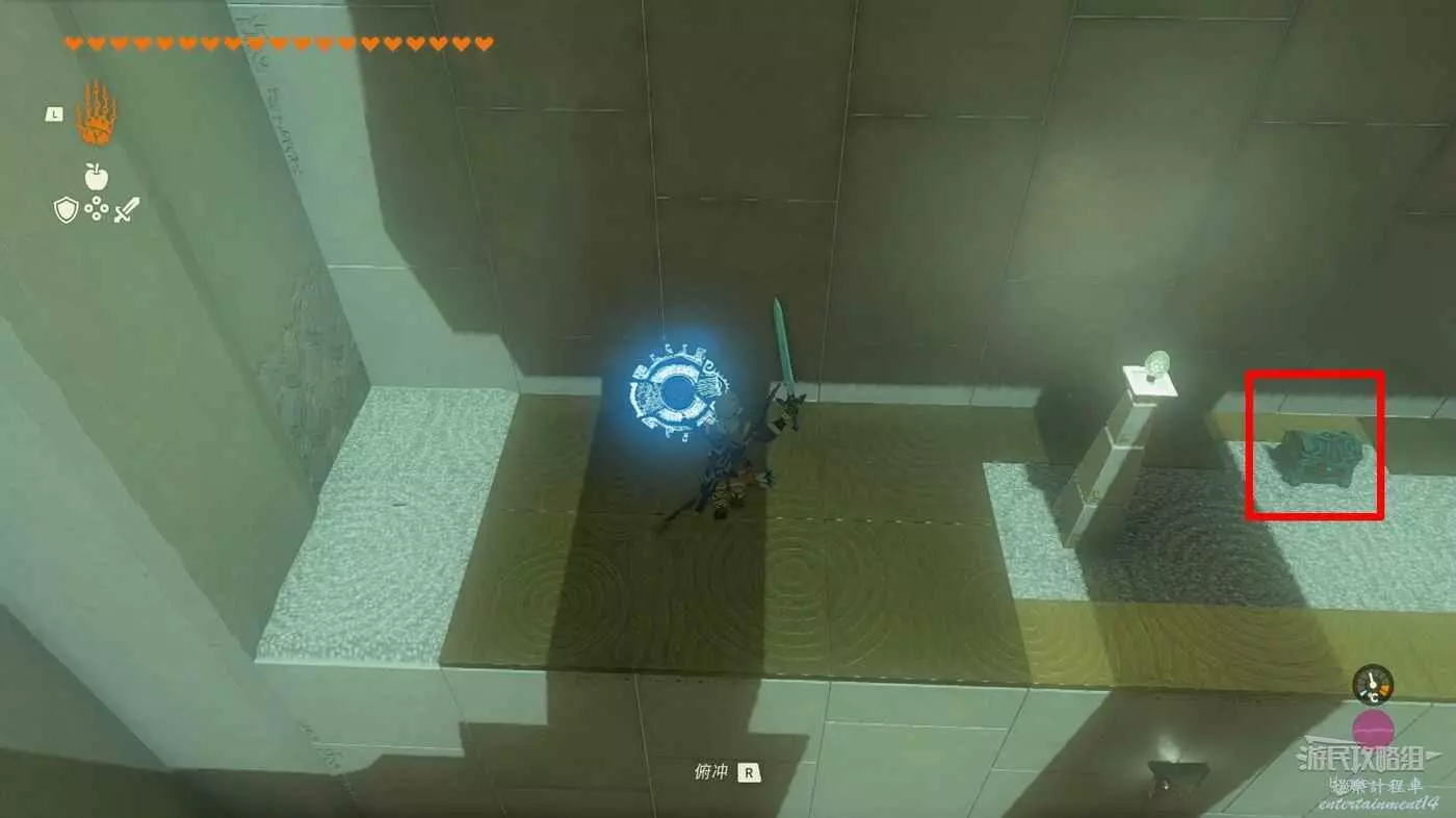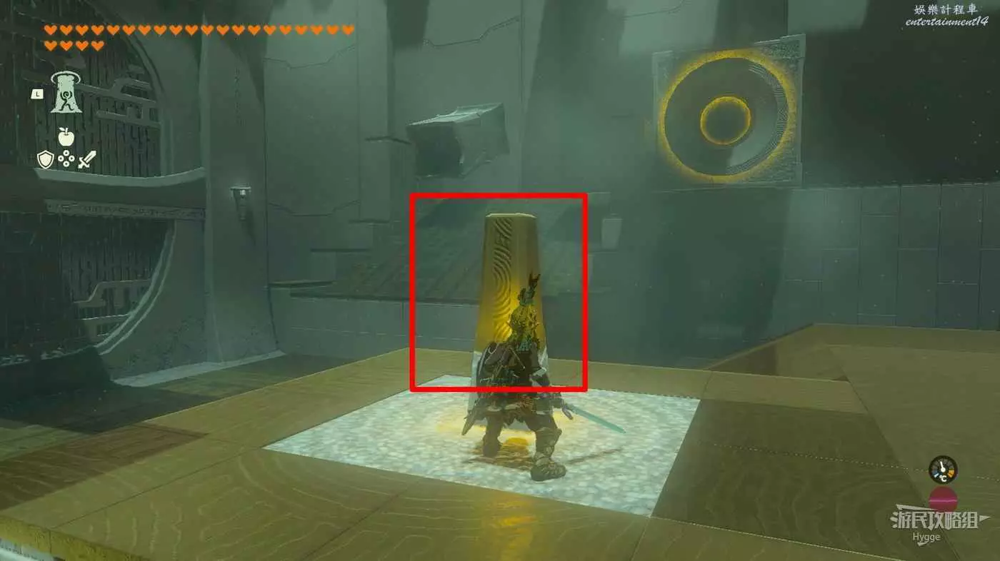 先把鋼板拖到牆邊舉高再放下,隨後使用倒轉通過鋼板到達上層平臺拿到寶箱。