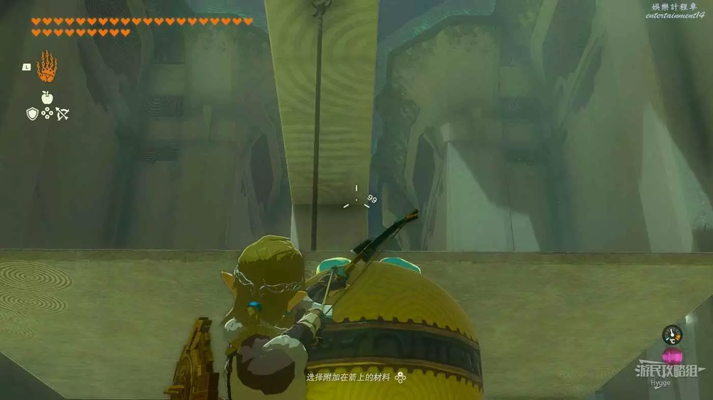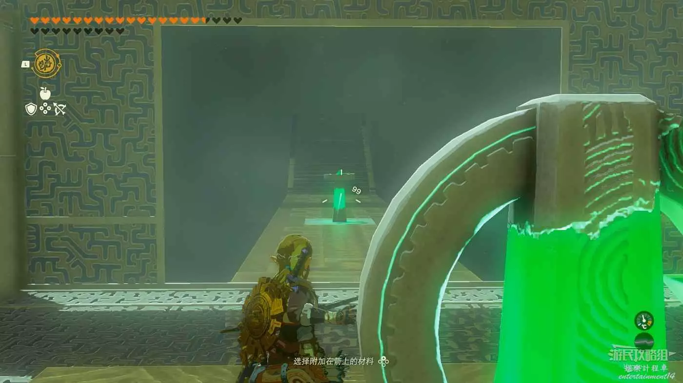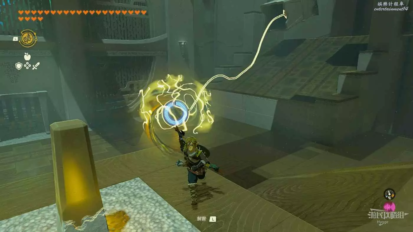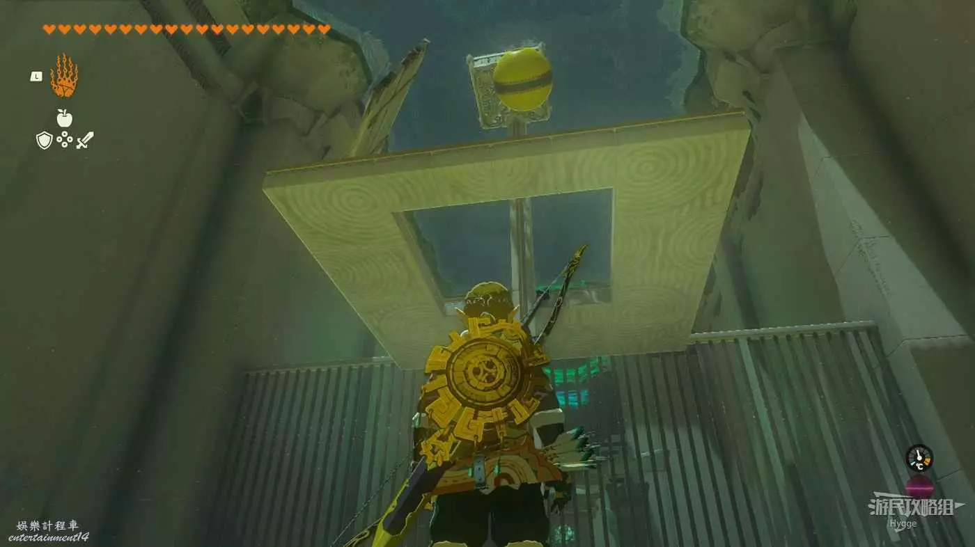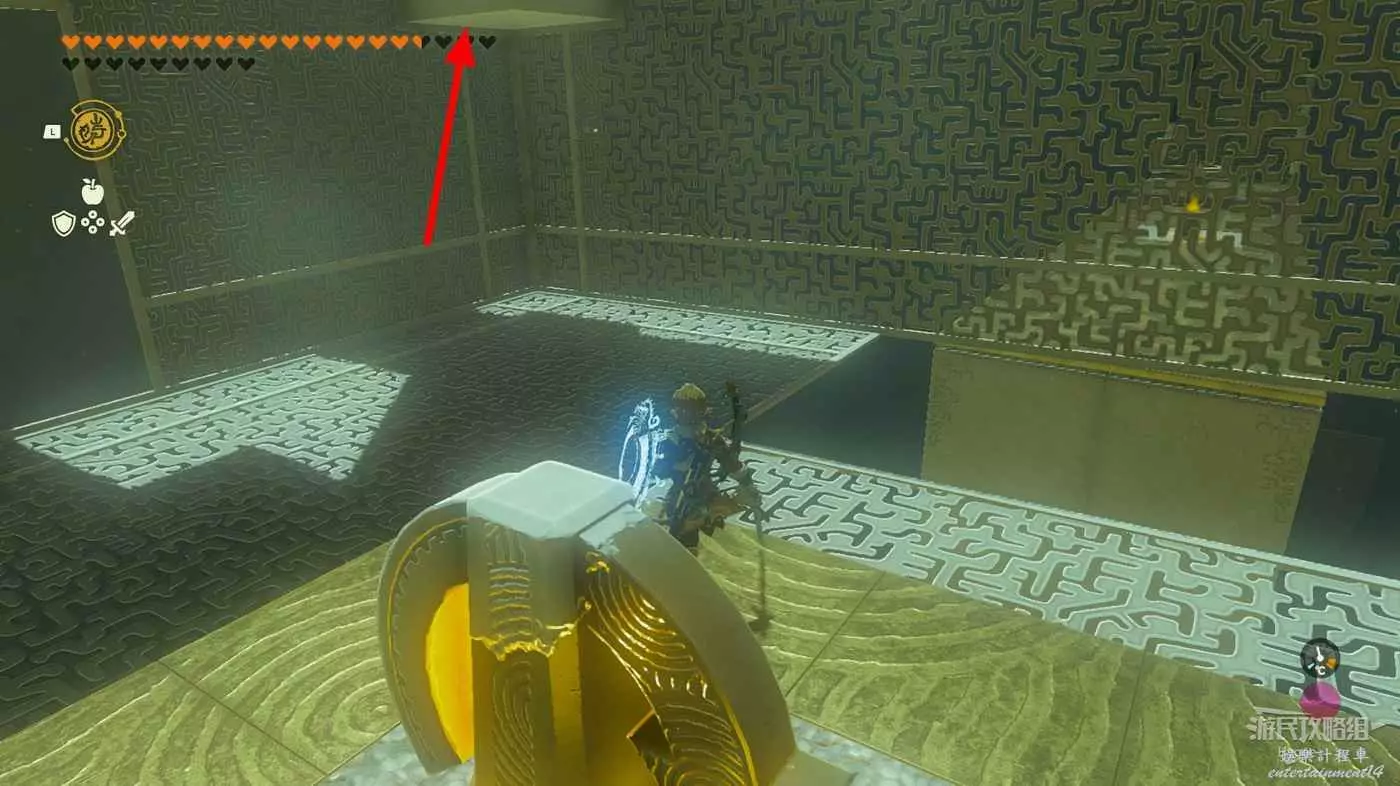 進入神廟後將黃球粘在石板下,隨後射斷繩索即可通過石板到達前方區域。