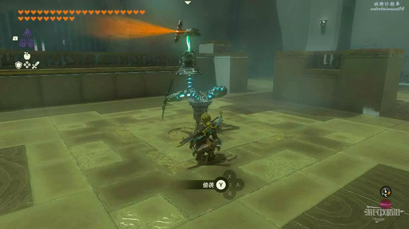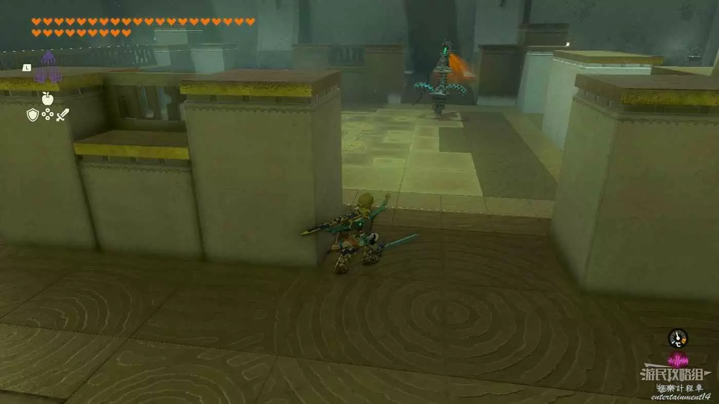 該神廟為潛行教學神廟,我們需要按下左搖杆蹲下,悄悄從背後接近敵人。