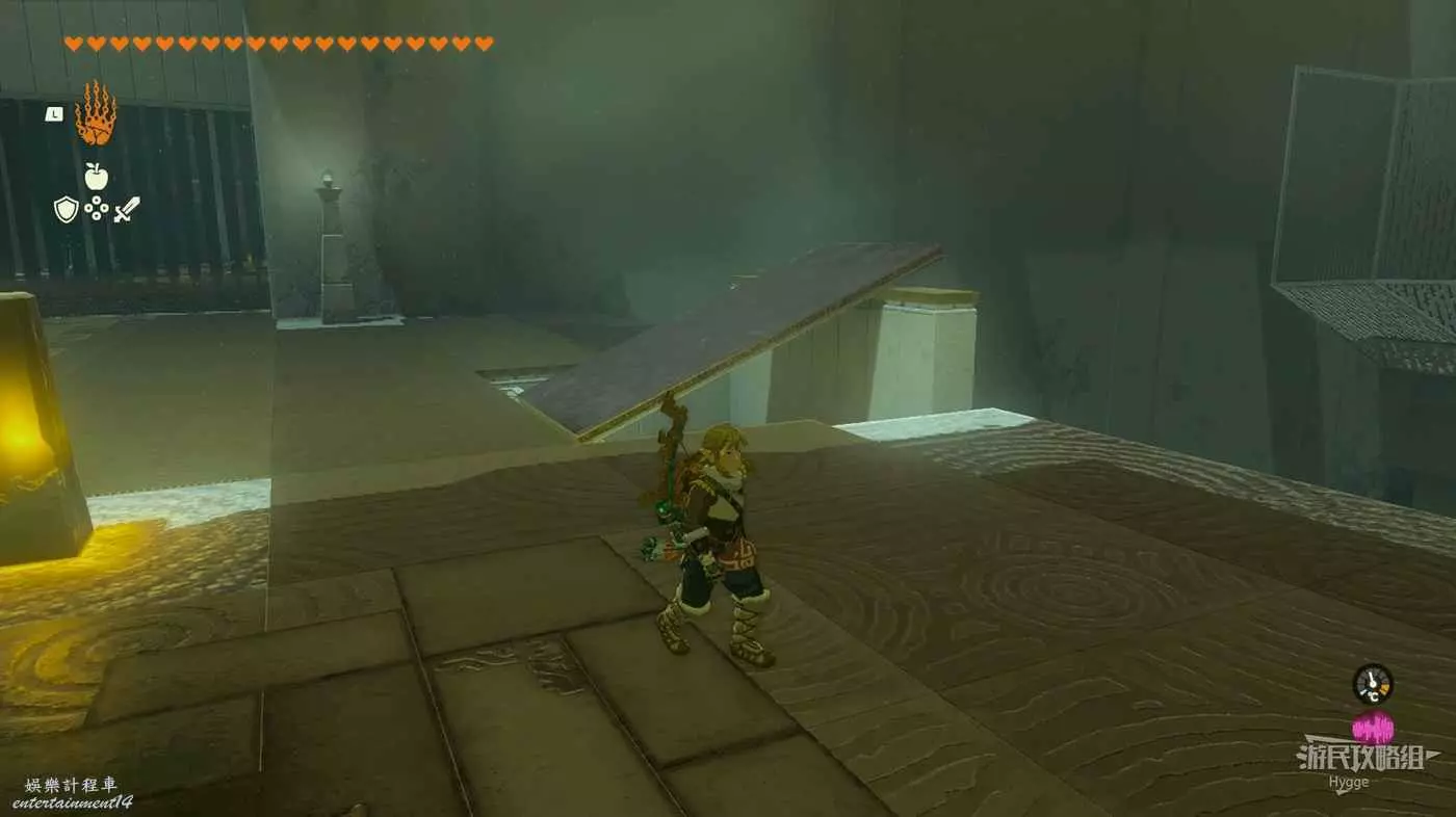 來到雷鳴之島後找到滑軌,在滑軌旁找到一個已經拼接好了的T字形木板。