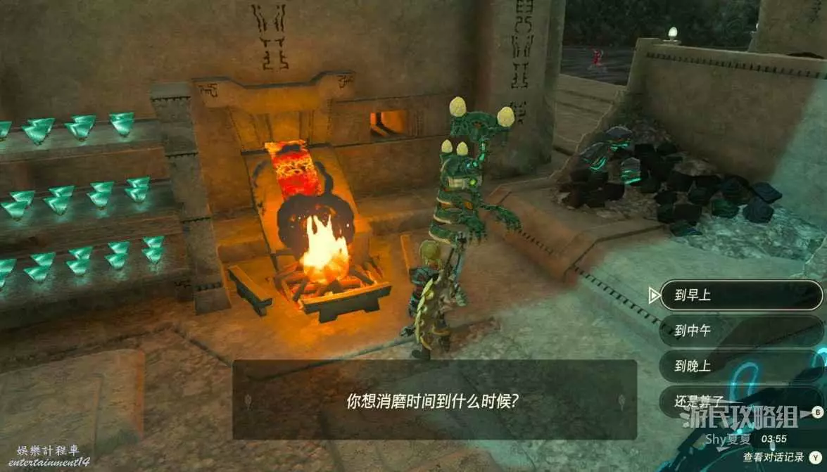 第六步:把木柴捆扔到旁邊的爐子上,把木柴捆變為篝火,調整時間早早上,早上之後讀取遊戲,左納烏能源結晶就刷新了。