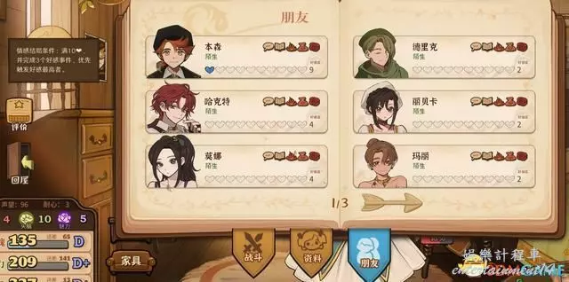 朋友介面則會顯示可供攻略的角色們,當愛心指示條達到10時,可以在終局觸發對應的特殊劇情。