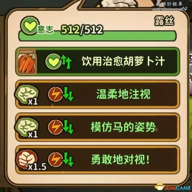 在嘗試馴服時,可以通過“飲用胡蘿蔔汁”來恢復意志。