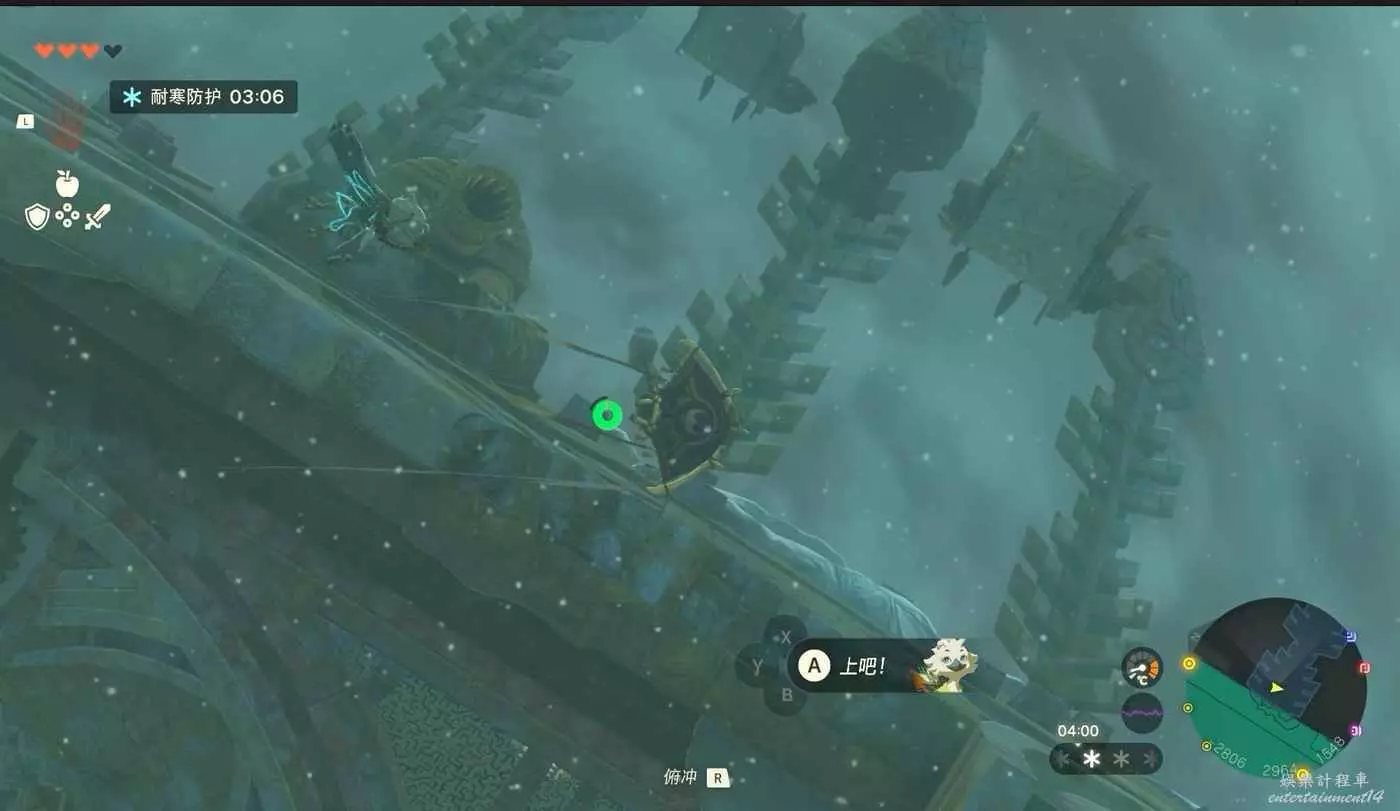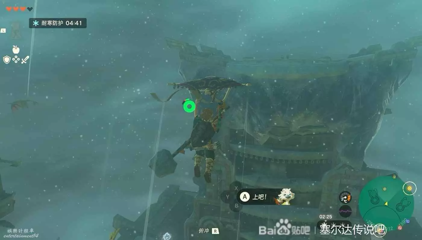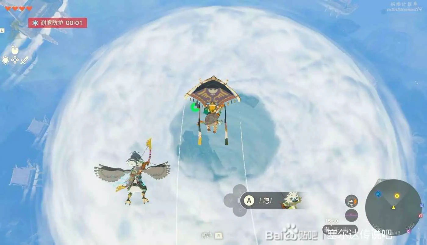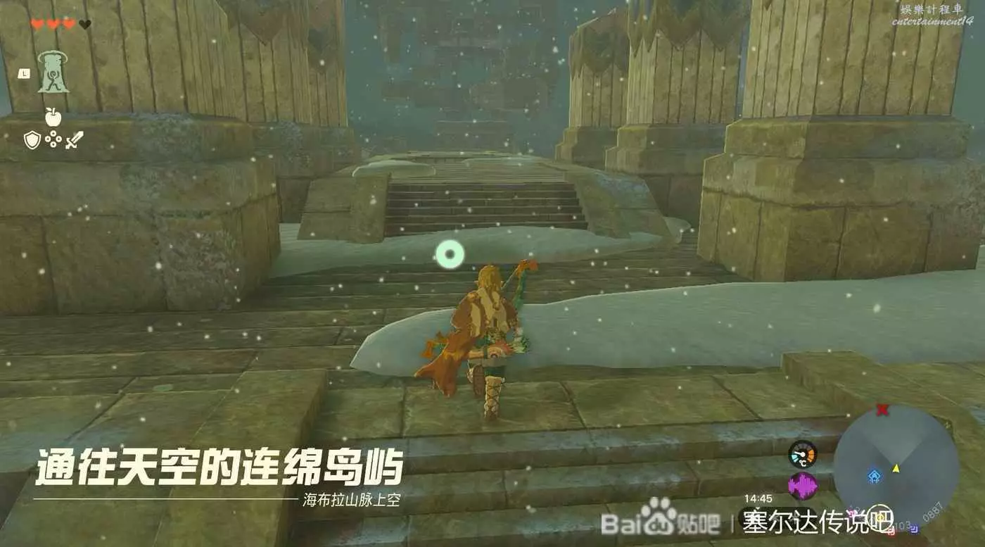 戰鬥結束以後需要前往浮空島嶼。這裡需要慢慢一路從連綿島嶼一路往上爬,路有點遠,不過也不算難走,好好利用吹風技能就行。路上還有神廟記得開了方便傳送,並且上去以後需要二級防寒。