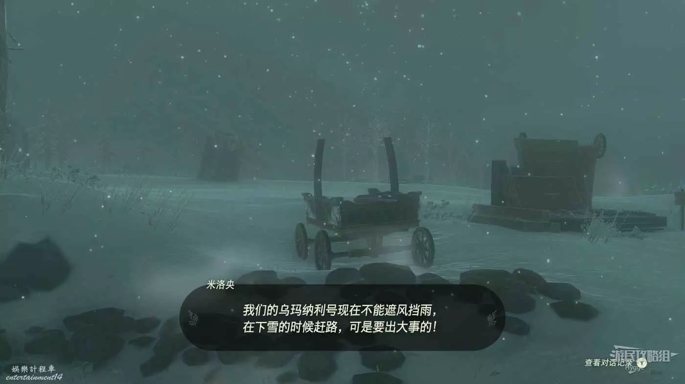 與驛站旁邊的樂團成員交談得知馬車現在不能遮風擋雪,因此無法上路。