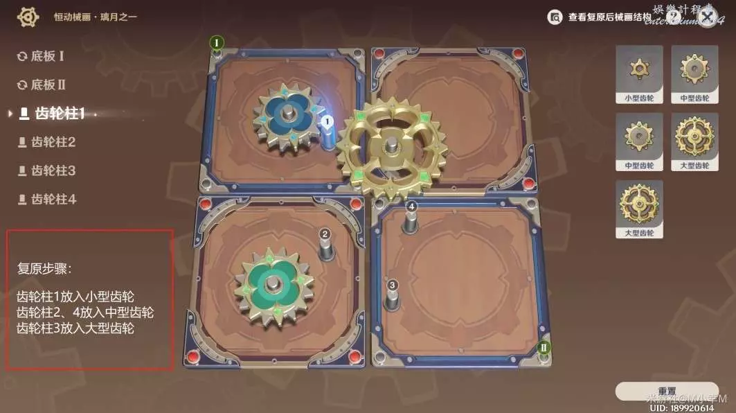 第三步:點擊齒輪柱1放入小型齒輪,齒輪柱2、4放入中型齒輪,齒輪柱3放入大型齒輪