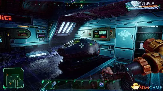 在這個醫療區,你可以找到治療艙(綠色艙體)和能量恢復裝置(藍色柱狀),使用它們可以幫助你恢復生命值和能量值。
